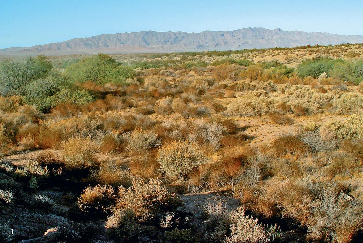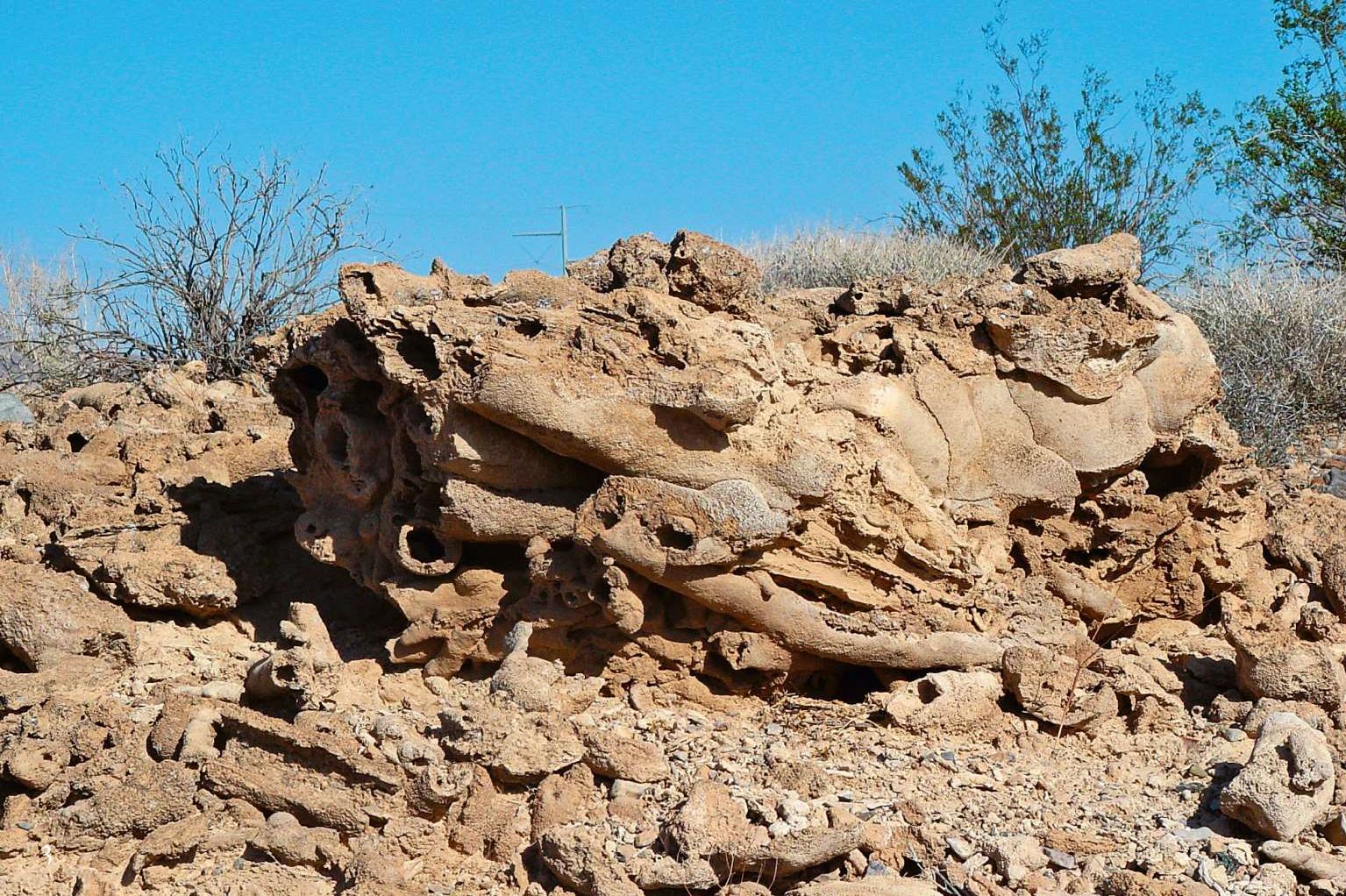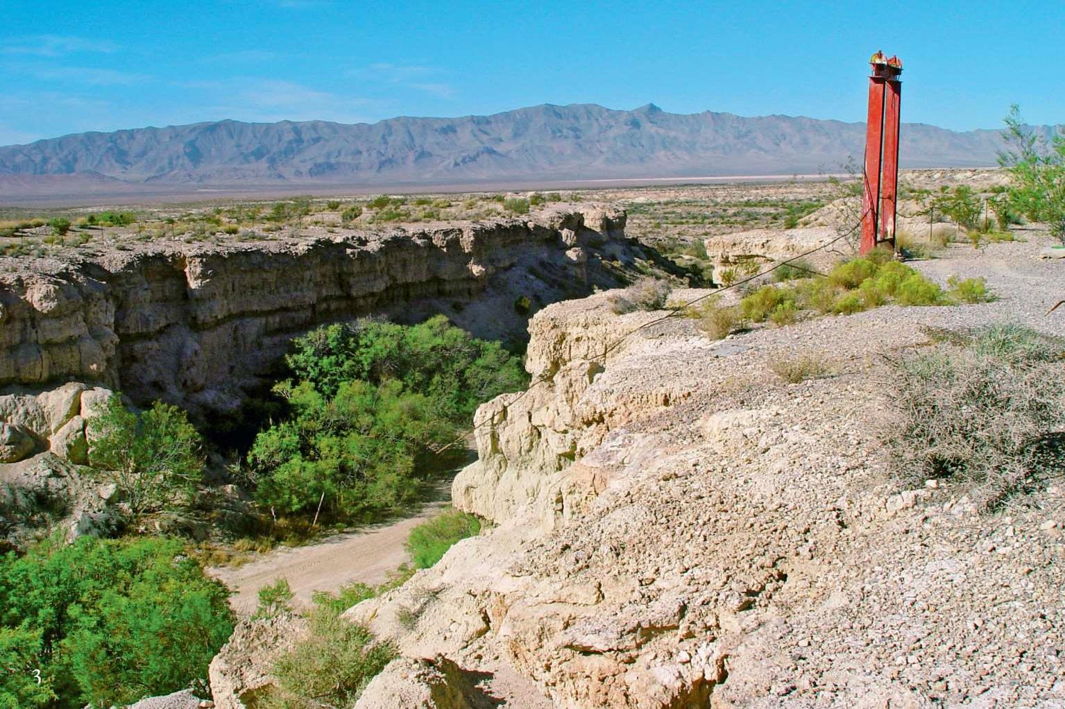 第三个地点是阿弗顿(Afton)峡谷,也被称为莫哈韦大峡谷。观察点在15号州际公路南侧,就是阿弗顿次级盆地的边缘。这里的植物似乎含有丰富的钙质,使其干枯的枝叶看起来又硬又脆。我们观察到强有力的岩石学证据,它记录了来自更新世的曼尼克斯湖水第一次侵入阿弗顿次级盆地的沉积物。阿弗顿峡谷是在更新世末期由莫哈韦河冲刻出的又深又宽的河谷。在河的南侧,平坦的绿色湖湘沉积物和含砾石的薄层扇三角洲沉积不整合地覆盖于更老的新近纪岩石之上。曼尼克斯湖通过阿弗顿峡谷的下泄被认为是一次灾难性事件,整个过程只持续了10个小时左右。