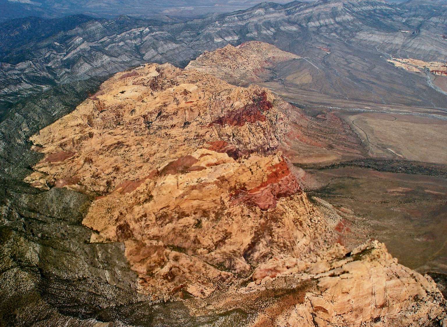 海岸山脉和内华达山脉沿南北走向纵贯在北美大陆西部,它阻挡了太平洋的潮湿气流,使山脉以东的美国内华达等州变得异常干旱。从旧金山乘机去拉斯维加斯(Las Vegas)的航程上可以清楚地看到这个变化,1个小时后就从苍绿的湾区来到毫无生机的干涸之地。在飞机的舷窗上已经清楚地看见了这个沙漠城市的面貌,拉斯维加斯的周边环绕着1000~3000米的高山,裸露的岩石大多呈褐黄色、还有的赤红,而市区规划成棋盘形的方格,已开发好的部分可以见到一点人工栽种的树木,尚未建设的地方就完全是黄沙铺就。让人想不到的是,拉斯维加斯的西班牙语的含义竟然是“肥沃的青草地”,因为它是荒凉的沙漠和戈壁地带中央唯一有泉水的绿洲。