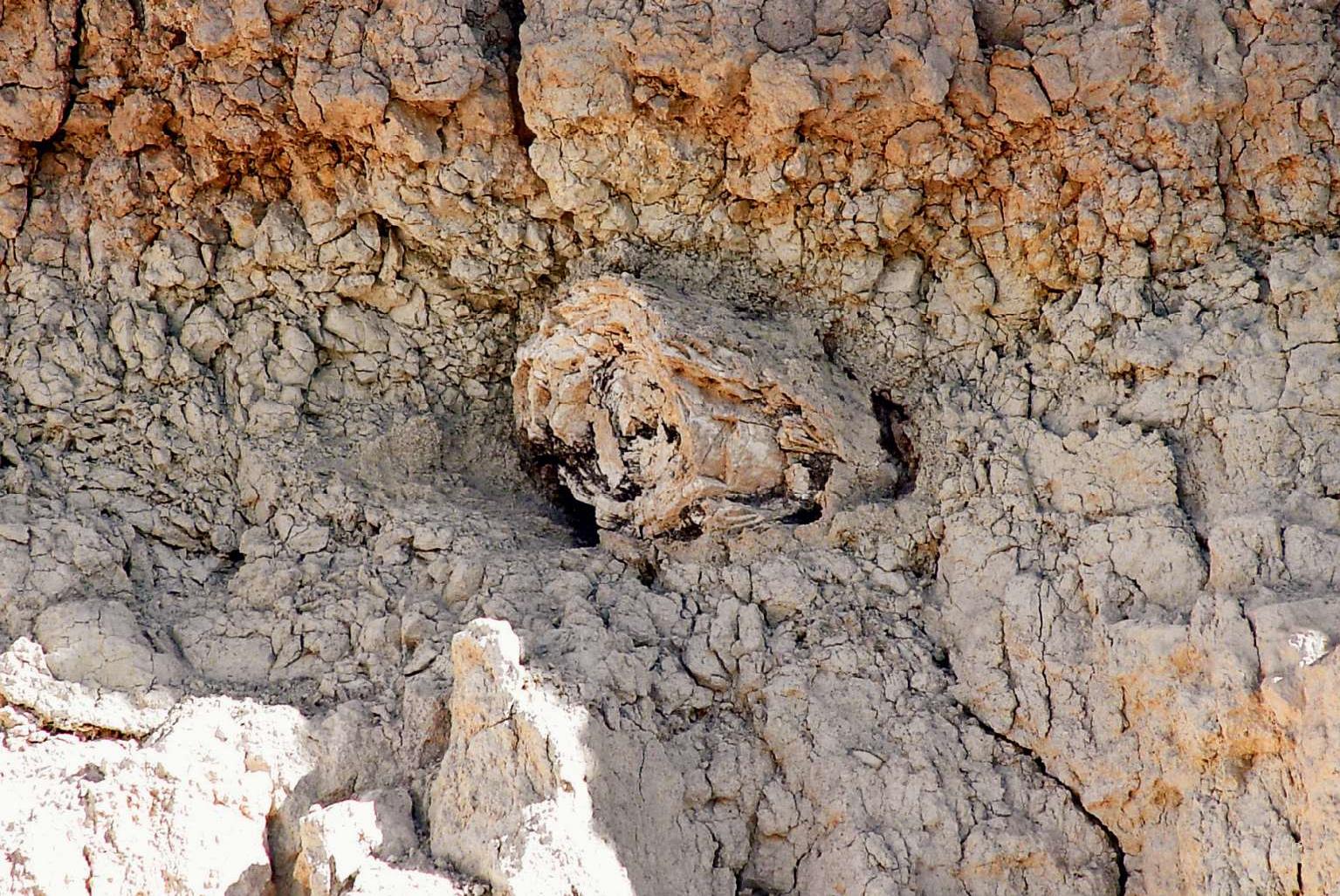 接下来去的隐秘谷(Hidden Valley)是一个冲沟,有7米深,由于第四纪晚期泉水渗出而冲刷形成。沟壁上有很多神龛遗迹,看来以前是一个不小的宗教场所,还有耶稣塑像,不过头、手都断了。地面上有很多子弹壳,应该有人来此打猎。在崖壁上出露有一枚巨大的象门齿,截面很清楚,在这里发现的化石还包括骆驼和真马。