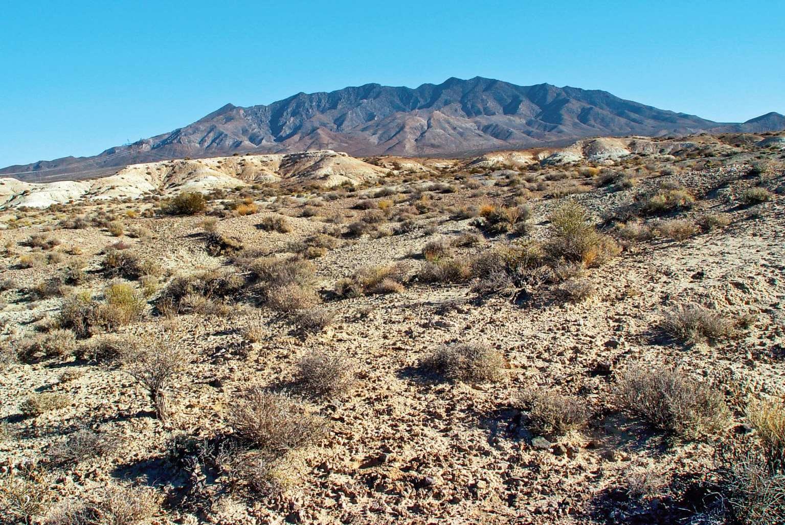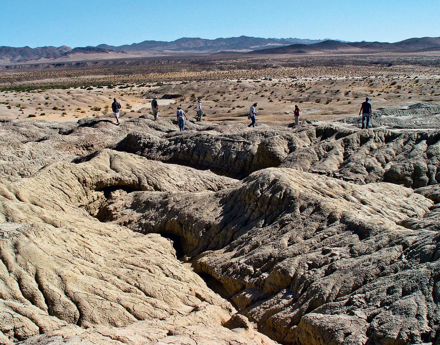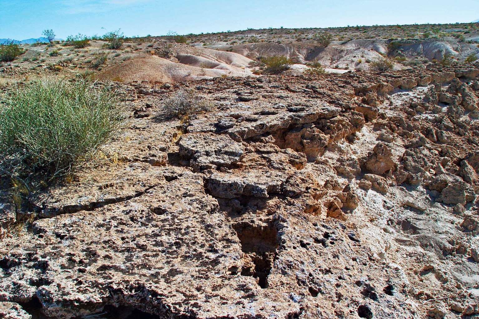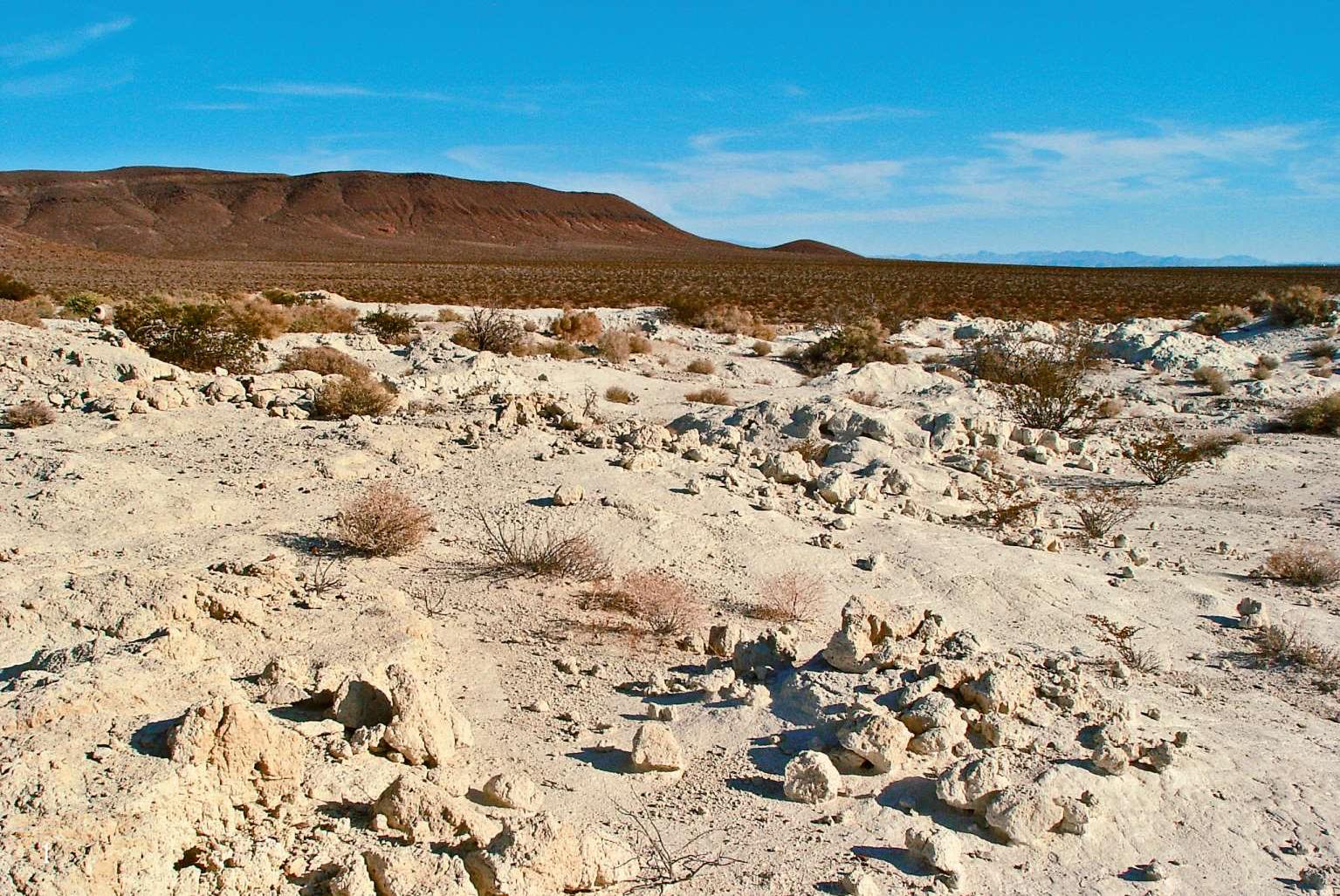 第二天一大早,在拉斯维加斯的巴黎饭店外看到了印有SBCM标志的车,这次考察是由加利福尼亚州的圣贝纳迪诺县博物馆(San Bernardino County Museum)负责组织的。8点钟从集合地点出发,三辆越野车加一辆皮卡,我们的队伍有17人,很热闹。首先越过内华达州与加利福尼亚州的边界,沿15号州际公路前往第一个观察地点韦尔斯(Wells)山谷,它位于莫哈韦国家保护区内。在韦尔斯山谷的公路两旁都可以看到广布的晚更新世细粒沉积物,由地下水淀积形成,对比现在莫哈韦荒漠的干旱状态,可以看出气候发生了多么巨大的变化。地层的结构通常是由地下水碳酸钙淀积物和细粒的河流或风成沉积物组成,还包含有机质。在冰期时代,莫哈韦沙漠的地下水位明显高于现代。韦尔斯山谷的地下水补给来源于东面不远处的克拉克(Clark)山脉,我们站在观察点上就可以清楚地看到地形的高低差异。