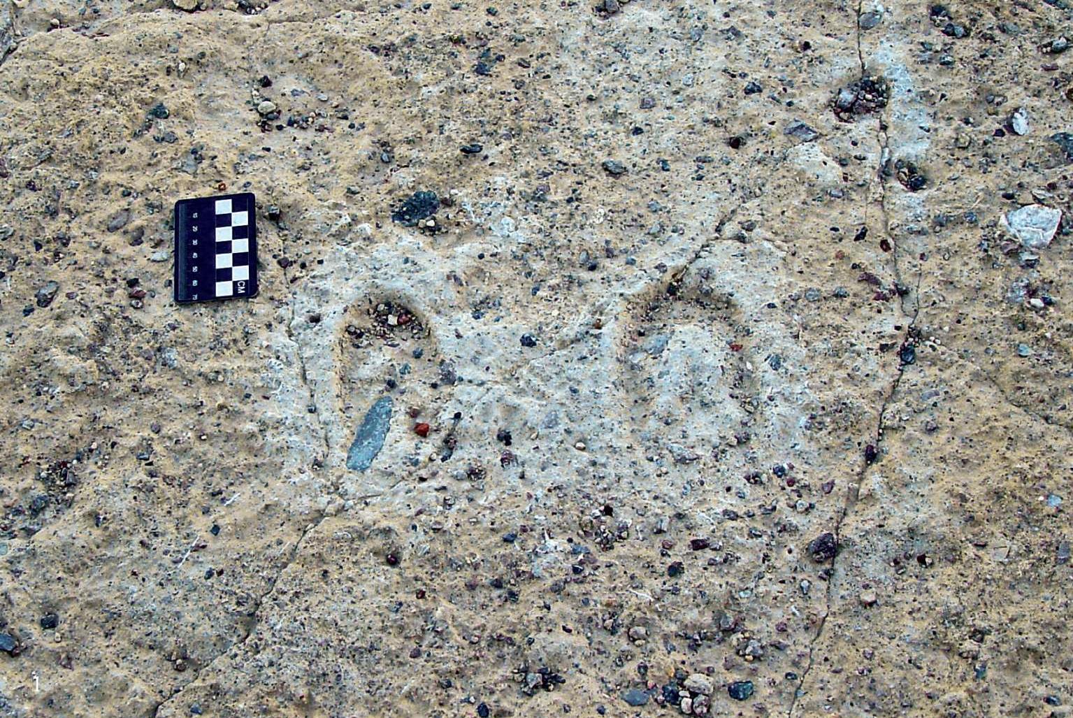 考察队中有几位熟悉本地情况的专家,他们分别来自圣贝纳迪诺县博物馆、拉斯维加斯博物馆和内华达州立大学,其中圣贝纳迪诺县博物馆的斯科特(Eric Scott)馆长是我熟悉的同行和老朋友,他担任这次考察的队长。总是一个专家先介绍一段地层的沉积情况,然后另一个专家介绍相关的化石。在这套地层中发现的哺乳动物化石对时代的确定起到了重要的作用,包括底部的上新世至早更新世的对齿鼠( Symmetrodontomys )和食蝗鼠( Onychomys ),以及更高层位的早、中更新世的南方猛犸象( Mammuthus meridionalis ),最上部的地层中发现过一枚晚更新世的哥伦布猛犸象( M. columbi )的颊齿。哥伦布猛犸象常常被错误地称为哥伦比亚猛犸象,这是因为其拉丁文种本名columbi被想当然地与地名Columbia相联系。其实熟悉拉丁文命名的人都知道,“i”是种本名中跟在人名后的词缀。哥伦布猛犸象发现于北美洲和中美洲,从未出现在南美洲国家哥伦比亚,其得名也与有这种猛犸象分布的加拿大不列颠哥伦比亚省无关,就是为了纪念哥伦布(Christopher Columbus)发现美洲大陆而命名的。韦尔斯山谷发现的大哺乳动物化石还包括真马、骆驼、叉角羚、一种郊狼大小的犬科动物和一种大型的猫科动物。在我们观察的化石点上可以见到化石碎片,它们非常脆弱,裹着一层碳酸钙外壳。小型的脊椎动物化石包括树蛙、蟾蜍、蜥蜴和蛇的遗存,还有兔、囊鼠( Thomomys )、更格卢鼠( Dipodomys )、鹿鼠( Peromyscus )和林鼠( Neotoma )。化石虽然不多,但都已有相关的论文发表。