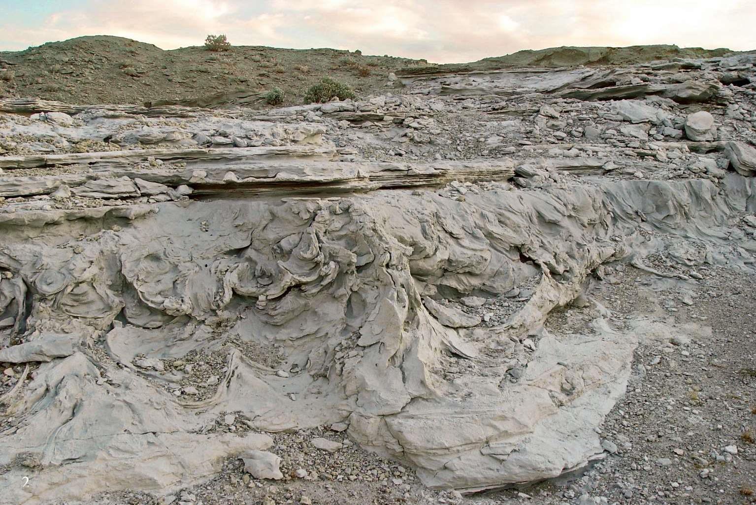 最后考察的是上拉斯维加斯冲沟内的第四纪末期“凝固在时间里的碳酸钙河流”,这是第一个在北美识别出来的河流泉华系统。蓝藻岩是亚球形到扁圆形的叠层结构,在低水流状态或静水条件下围绕一个碳酸盐、泉华或树木碎屑等核心形成,可生长到15厘米或更大。这些碳酸钙泉华展现了独特的形态,相似于贯通的流水网络,非常接近现代和全新世早期上拉斯维加斯冲沟的流水系统,不仅壮观,更是一种难得见到的奇观。