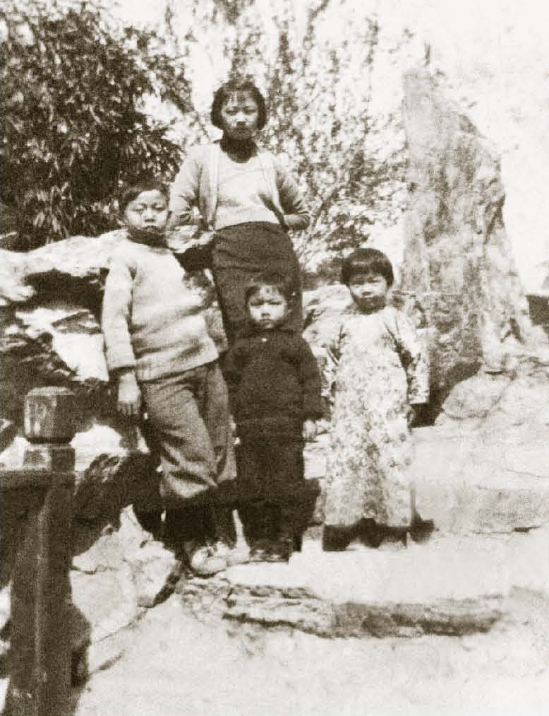 图1-5 兄弟姐妹四人在北京中山公园(前排左起:戴立信,弟弟戴立德,妹妹戴百龄,后排:姐姐戴惠英)