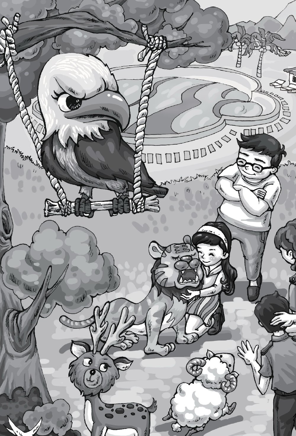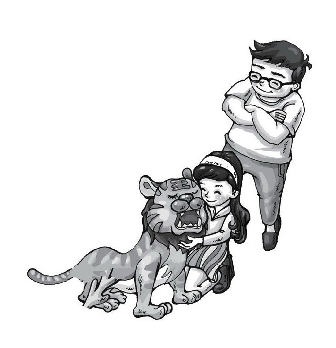 那对夫妇互相看了一眼,爽快地答应了。他们领客人到后院,这儿新建了一排石屋,比较简陋,与主建筑的豪华形成鲜明的对照。石屋分成一间一间的,住的都是动物,倒没有钢筋护网之类的东西,院门敞开着,住户都是些可爱的幼兽,有小羊羔、小鹿、一只小金雕,甚至还有一只虎头虎脑的小虎崽!看见主人来了,小家伙们迫不及待地奔过来,偎在主人的脚下,只有那只小金雕仍停在屋角的枯枝上,用冷淡的黄眼珠盯着客人,一副不屑一顾的样子。小李子最喜欢那头小虎崽,俯下身想去抚摸,但她显然低估了山大王的威风。别看这个小家伙不比猫大多少,竟然也龇牙咧嘴,喉咙里发出低沉的咆哮,小李子吓得赶快缩回手。何曼安慰她:别怕,它和你不熟,实际上它非常乖的。说着俯下身把虎崽抱到怀里,虎崽张牙舞爪地咬何曼的手指,小李子不由把心提到半空—毕竟是一只老虎啊,它的一口白森森的钢牙让人畏惧。但虎崽只是在与主人嬉闹,并不真的用力咬。