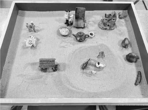 玩具是世界的缩影。世界上有多少实物,或者说有多少精神需求的理念,就可以被复制出多少玩具。在沙盘疗法工作中,选用的每一个玩具对来访者来说,都是真实的存在:一棵小树的模型就是一棵真实的树,一只老虎的模型就是一只真实的老虎。每个玩具都是真实的,都被赋予了生命或者精神的意义,甚至这些玩具内涵的外延会被无限放大、扩展。在沙盘治疗中使用玩具时,人可以是物,物可以是人,随心所欲,形随意到,意到有形,不用言语表达,而是用玩具和沙盘元素表达,用场景造型及其过程表达,这就是它的语言,玩具就是在这种情景中最重要的“文字”。