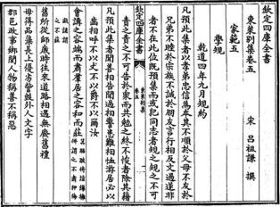 其次,这一时期的家风家训主旨从门第维护转向至敬宗收族。如吕祖谦的《家范》认为敬宗收族是宗法之纲目,“敬宗”是尊其所自来,知道血脉之根本,“收族”是团结宗族之人,穷困者收而养之,不知学者收而教之。
