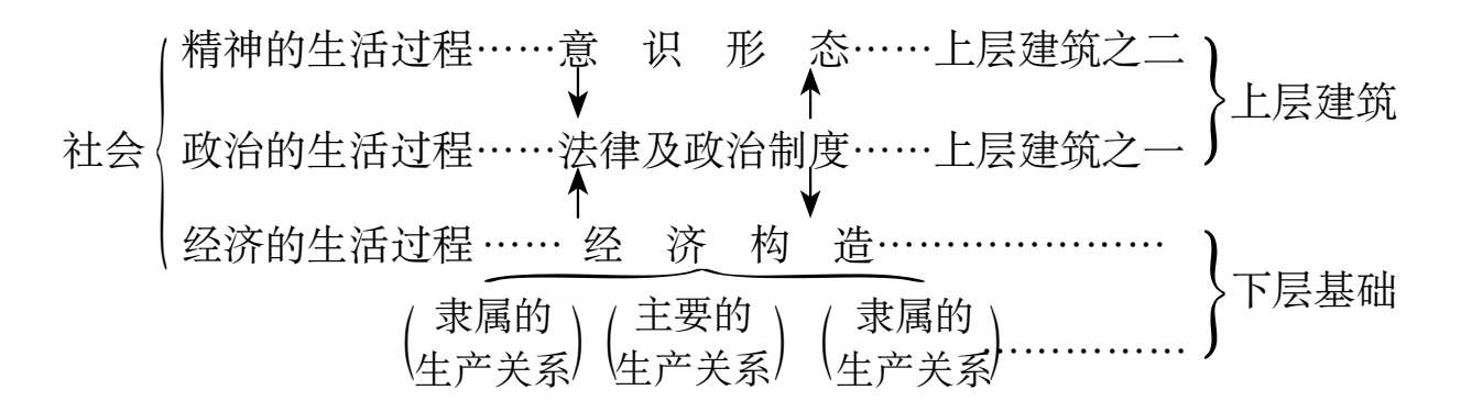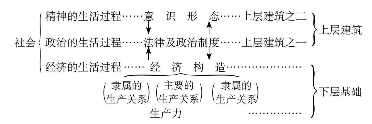 人类在其生存的社会生产上,加进一定的必然的与其意志无关的一些关系——生产关系。这些生产关系与其物质生产力发展之一定的阶段相适应。这些生产关系的总和,形成社会的经济构造——真实基础;在这基础上建立法律的政治的上层建筑,而一定的社会意识形态,也是适应这基础的。物质生活的生产方法,决定社会的政治的精神的生活过程之一般的性质……