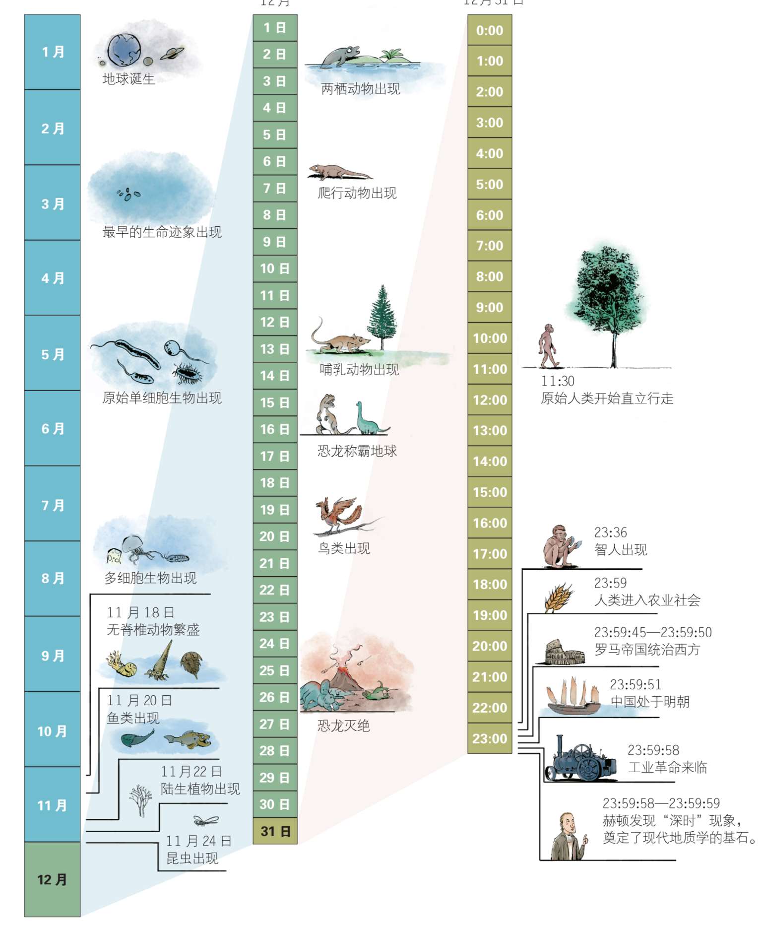 直到20世纪,科学家用放射性同位素测定:地球年龄为46亿年左右。46亿年是什么概念呢?假如把它“压缩”成我们平常的一年,人类直到年终12月31日接近午夜时分才出现。