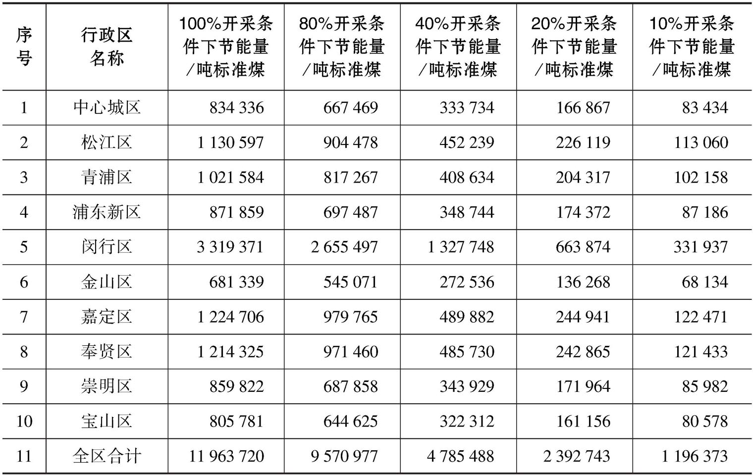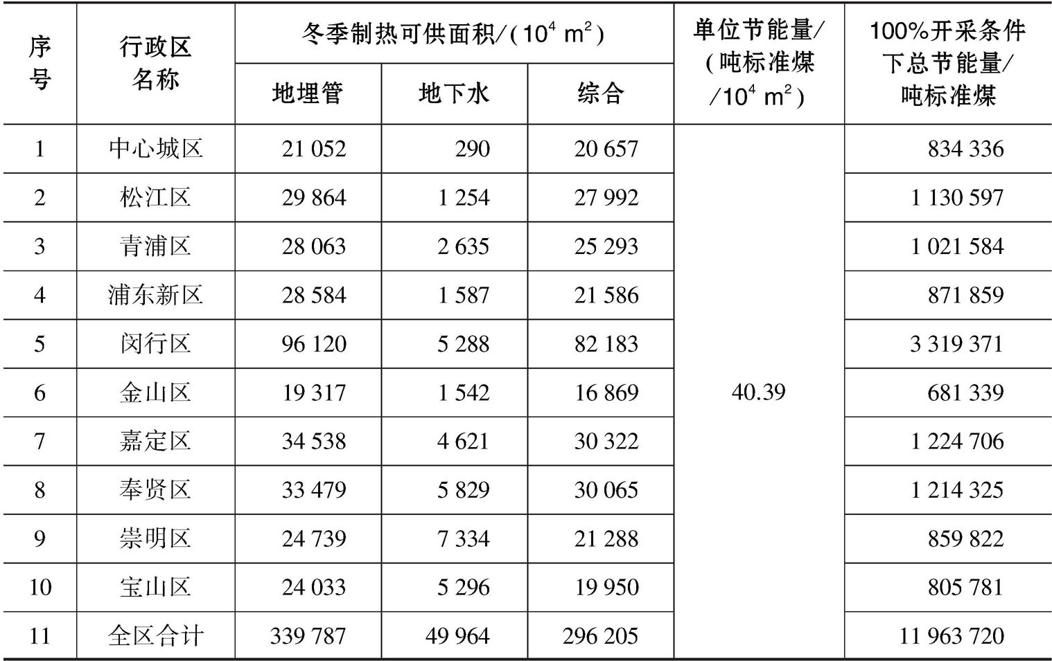 浅层地热能开发利用节能量估算的假设设计模式为:根据上海地区浅层地热能条件和负荷参数,以冬季供暖工况设计地下换热器,夏季采用辅助冷源进行调峰,使冬季向地下取热量与夏季向地下放热量基本平衡,采用浅层地热能冬季供暖可供面积进行节能量的估算;考虑到地埋管、地下水两者开采方式的相互影响,按照相关要求对于地埋管和地下水换热方式共同适宜区,采用2/3地埋管与1/3地下水可供面积之和的方式计算面积,分别设定开采的强度为10%、20%、40%、80%时对节能量进行估算,结果见表3-9和表3-10。