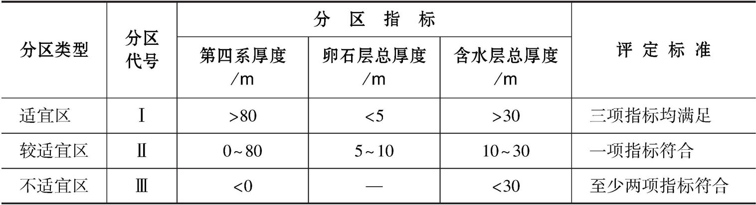 分区方法依据《全国重点城市浅层地温能调查评价及编图技术要求》,综合考虑岩土体特性、地层的换热能力、地下水的分布和渗流、地下空间利用、经济成本等因素进行分区,见表3-4。