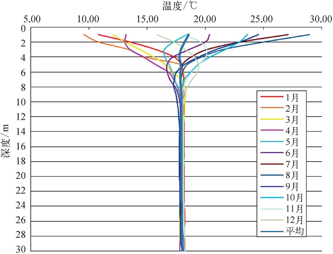 浅层地温场的垂向分布特征受当地气候、地层结构、地层岩性、水文地质条件、第四纪覆盖层厚度、地质构造等多方面因素影响。通常可分为变温带、恒温带、增温带。调查孔测温曲线显示,不同区域变温带深度由于受浅部土层岩性等因素的影响略有差异,其底界在9.0~17.0m,平均值为13.3m。