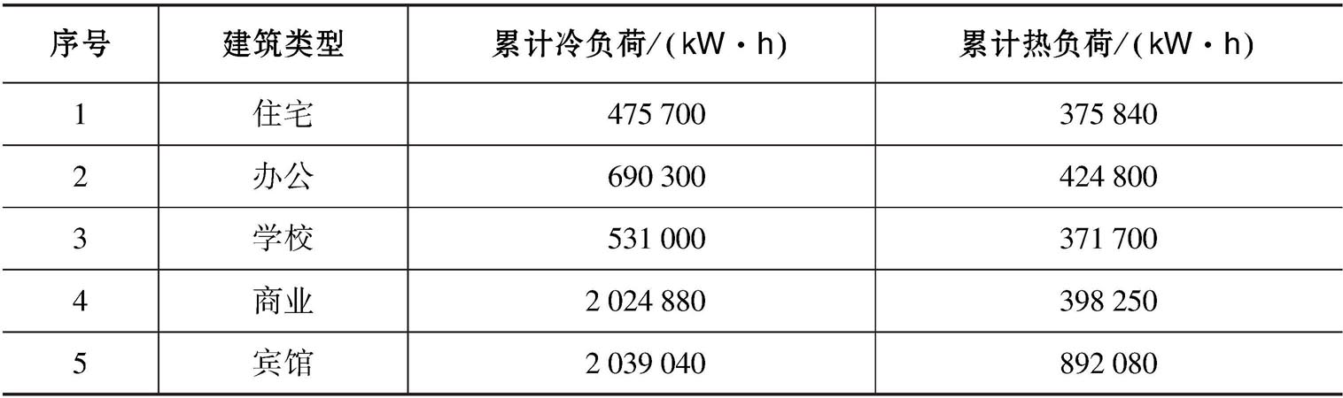 住宅建筑的制冷和供暖属于居民的个体行为,个体之间差异较大,累计负荷参照《夏热冬冷地区居住建筑节能设计标准》计算。住宅建筑夏季平均冷负荷指标取26.08W/m 2 ,运行时间为6月15日至8月31日,每天运行24h;冬季平均热负荷指标取17.4W/m 2 ,运行时间为12月1日至2月28日,每天运行24h。