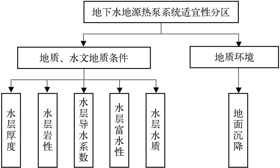 分区评价指标的选取主要从地质、水文地质指标和地质环境问题评价指标两个方面进行考虑。评价体系分为两级,如图3-6所示。第一级评价体系考虑地下水换热方式浅层地热能资源的赋存条件,即地质、水文地质方面;第二级评价体系主要考虑地面沉降地质环境问题制约因素与第一级评价体系的结果进行叠加后进行综合判别,进行地下水地源热泵系统适宜性分区评价。