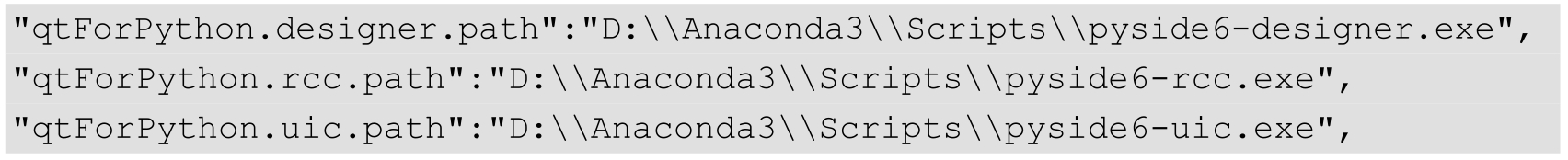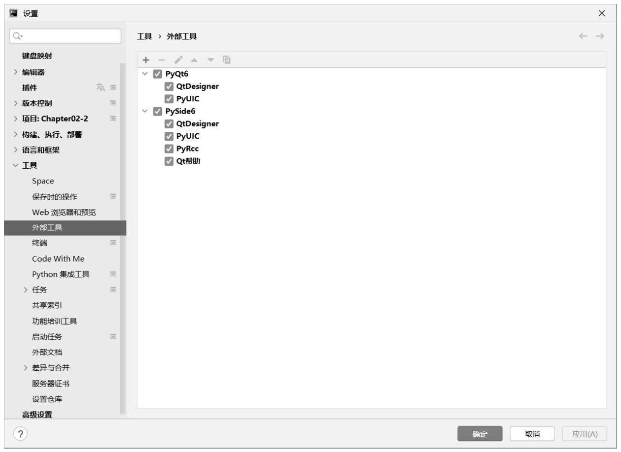因为PyCharm支持多个Python环境,所以需要指定一个Python环境(Anaconda环境),本节主要介绍在对PySide 6/PyQt 6进行开发的过程中使用Qt工具的方法。如图1-40所示,为开发环境添加几个PySide 6/PyQt 6的外部工具,方便快速创建、编辑和编译.ui文件,以及编译.qrc文件,以及快速查看帮助等。