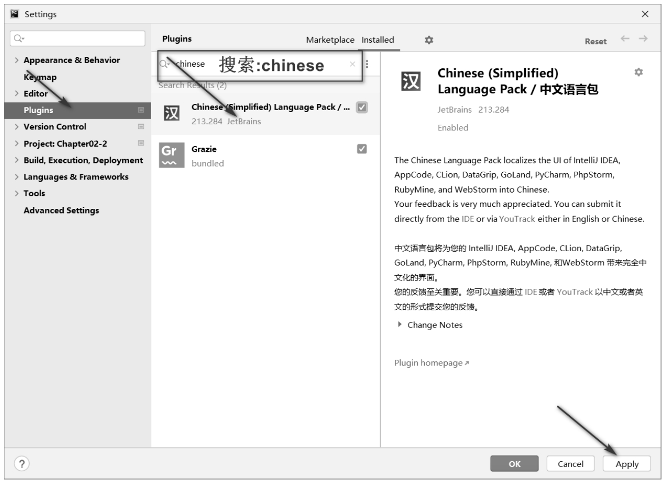 进入PyCharm主程序界面,选项默认都是英文的,可以通过安装插件对选项进行汉化。选择File→Setting命令,打开Settings对话框,下载Chinese插件并应用,重启后即可进入中文界面,如图1-39所示。