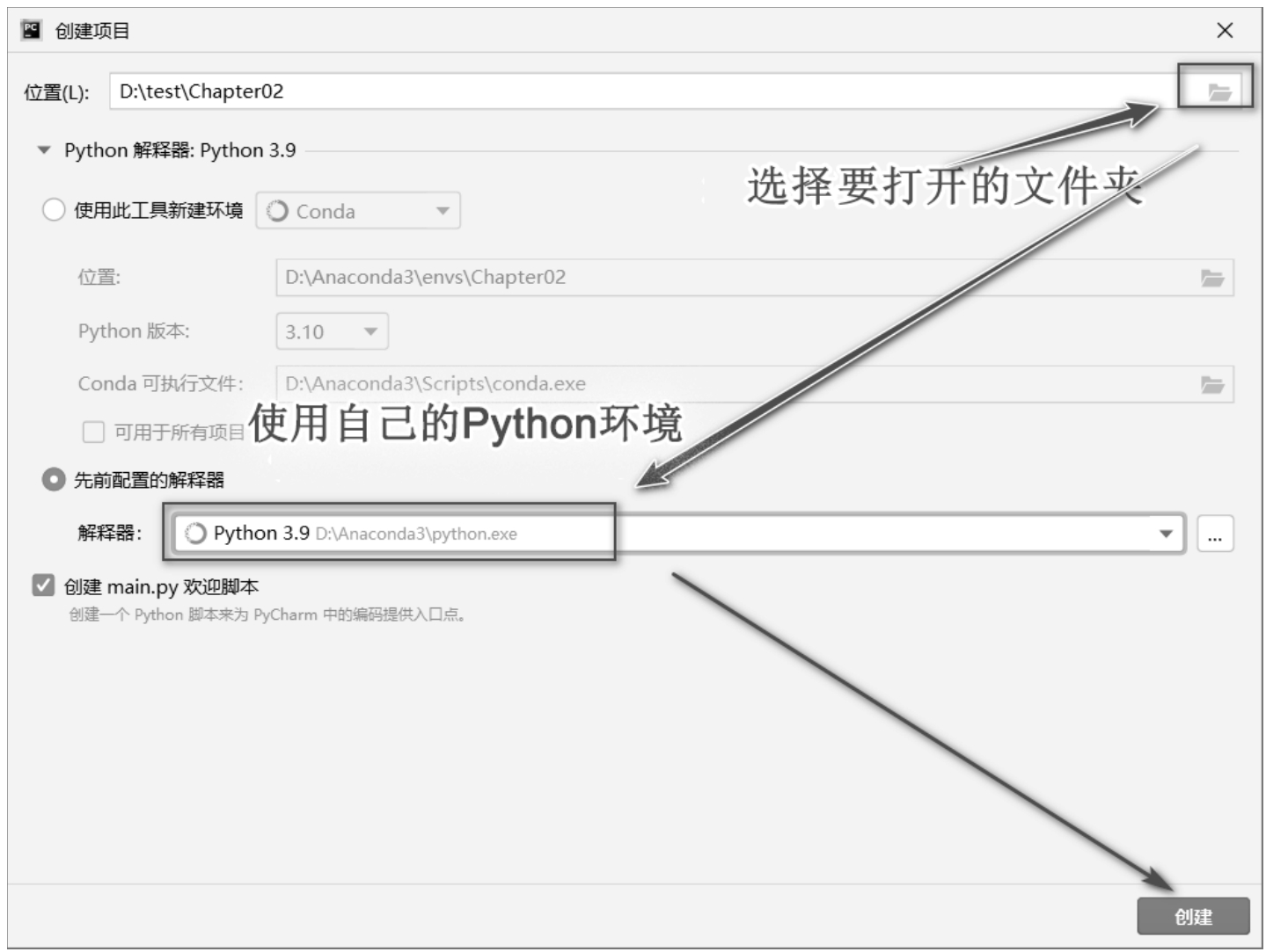 选择“文件”→“新建项目”命令,打开如图1-43所示的对话框,选择要打开的文件夹,设置完成后单击“创建”按钮。
