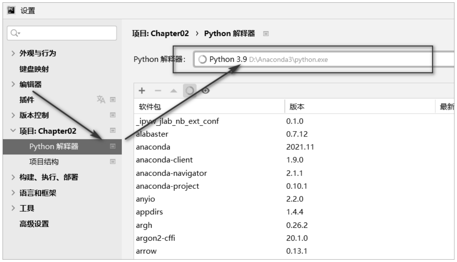 如果想要使用其他Python环境,如虚拟环境,则可以在如图1-49所示的“设置”对话框中进行修改。