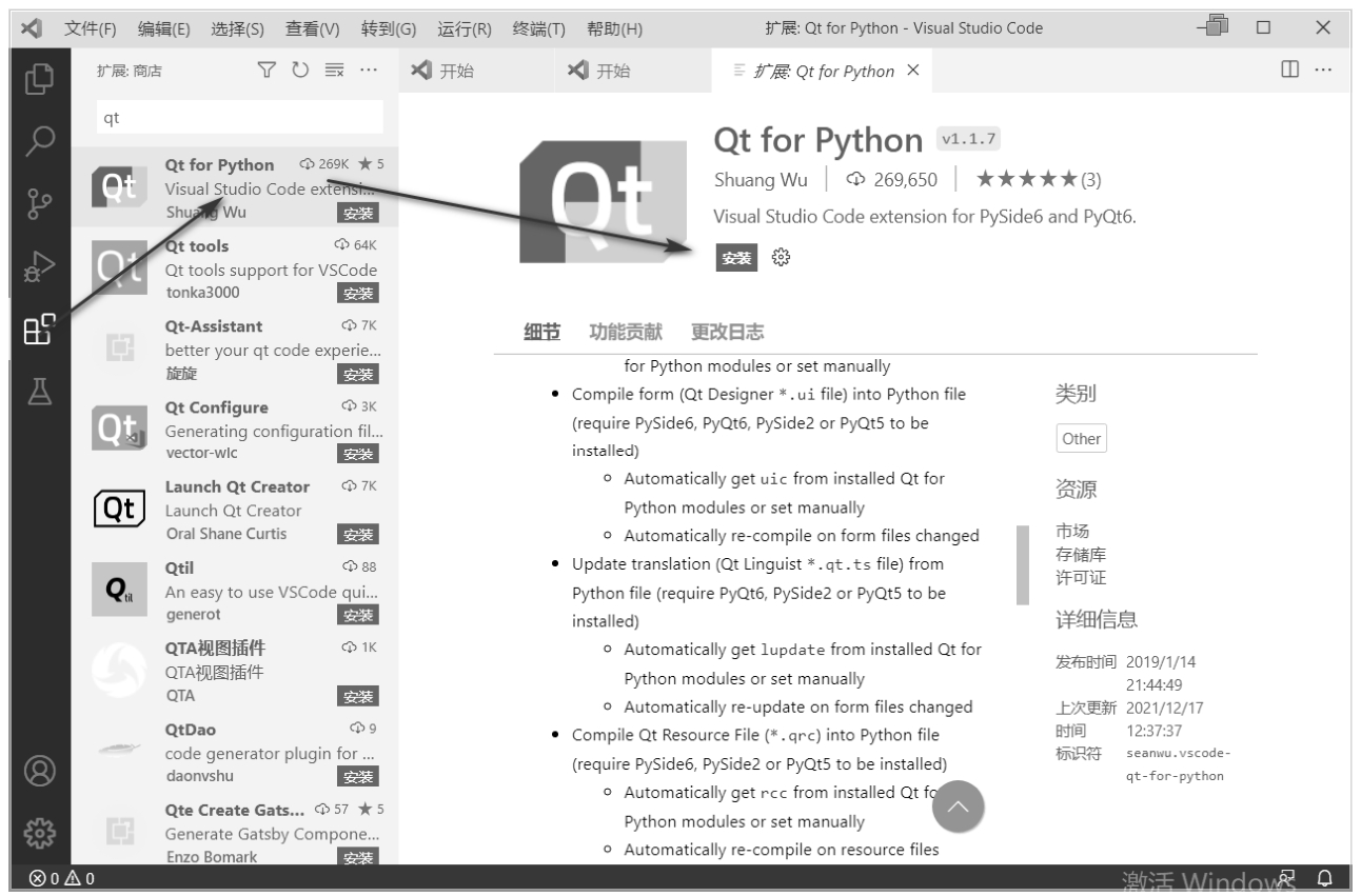 另一个是Qt扩展。它支持.qml、.qss、.ui等文件的语法高亮,基于PyQt或PySide把.ui文件或.qrc文件编辑成.py文件,是开发PyQt/PySide程序的利器,如图1-53所示。前面已经通过全局方式搭建了Python环境和PySide/PyQt环境,VSCode会自动识别它们,不需要额外配置。