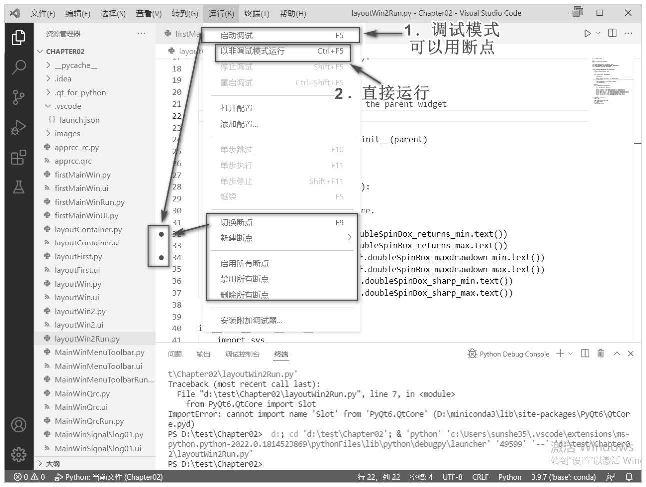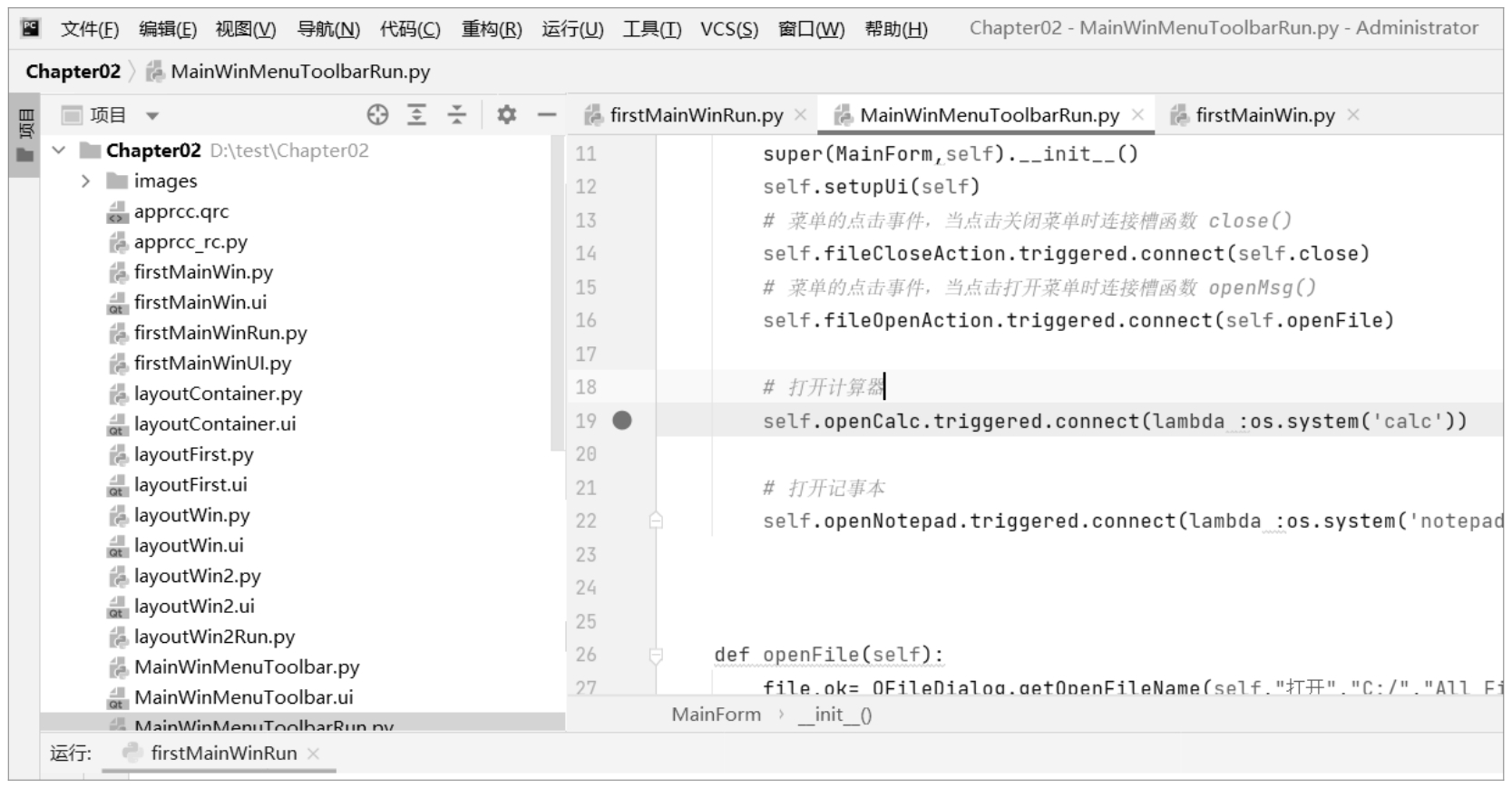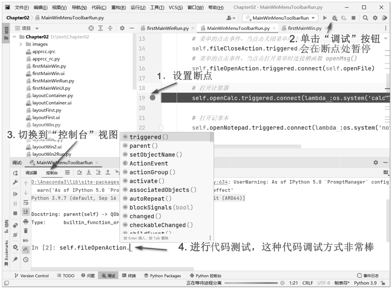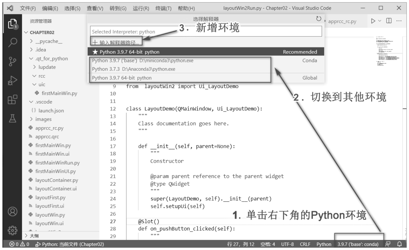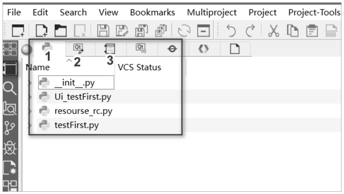图1-30中有1、2、3这3个选项。第1个选项用于编辑代码文件(.py文件);第2个选项的功能是使用Qt Designer编辑.ui文件,以及使用其他工具编译.ui文件(转换成.py文件);第3个选项用来编译资源文件.qrc。