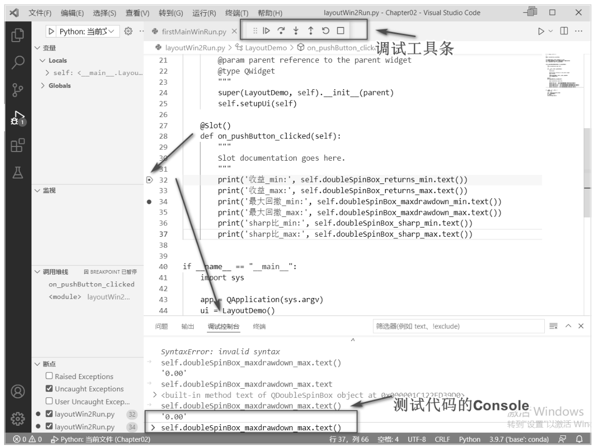 假设已经成功运行了文件,则可以通过如图1-47所示的方式进行调试,可以看到这种调试方式和使用IPython Console编写代码的体验是一样的。