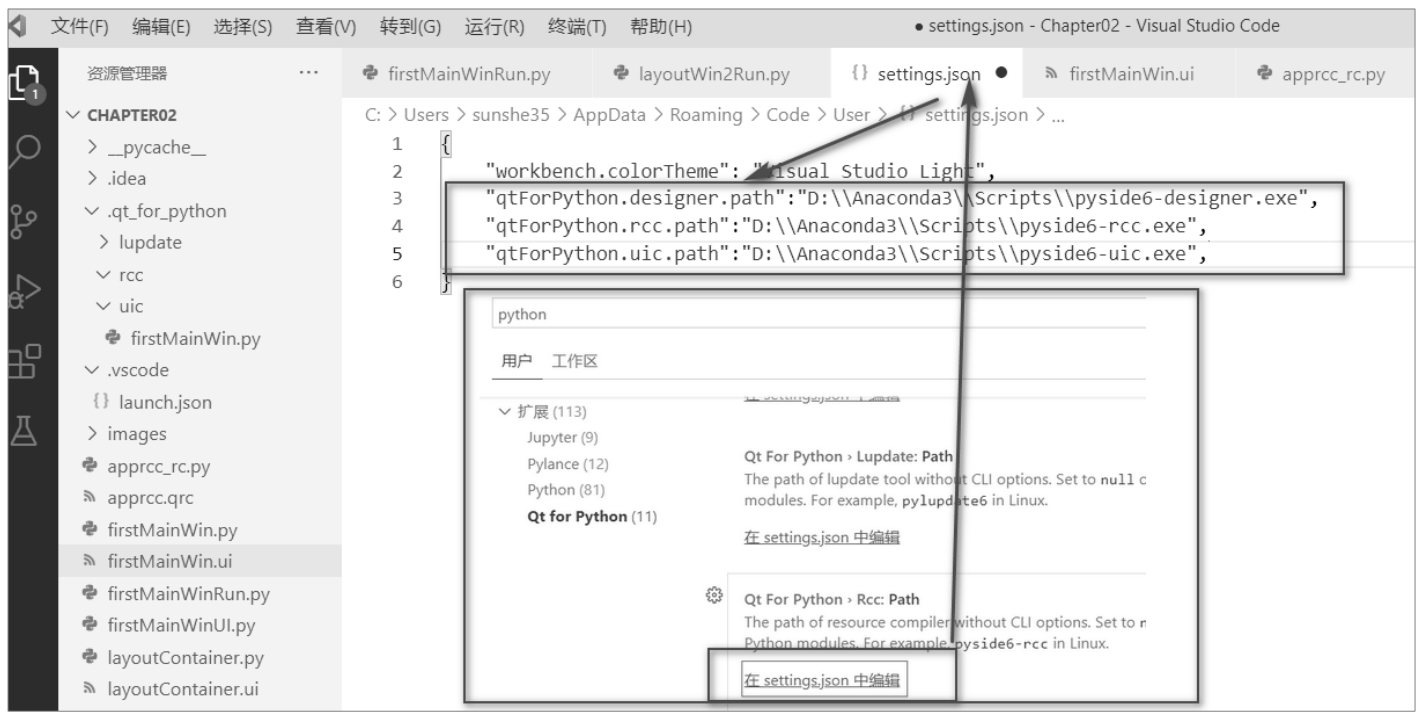 搭建好本地Python环境和PySide 6环境之后,VSCode会被自动检测并使用,可以在settings.json文件中自定义其他路径。在“设置”对话框中,可以通过如图1-57所示的方式打开settings.json文件。