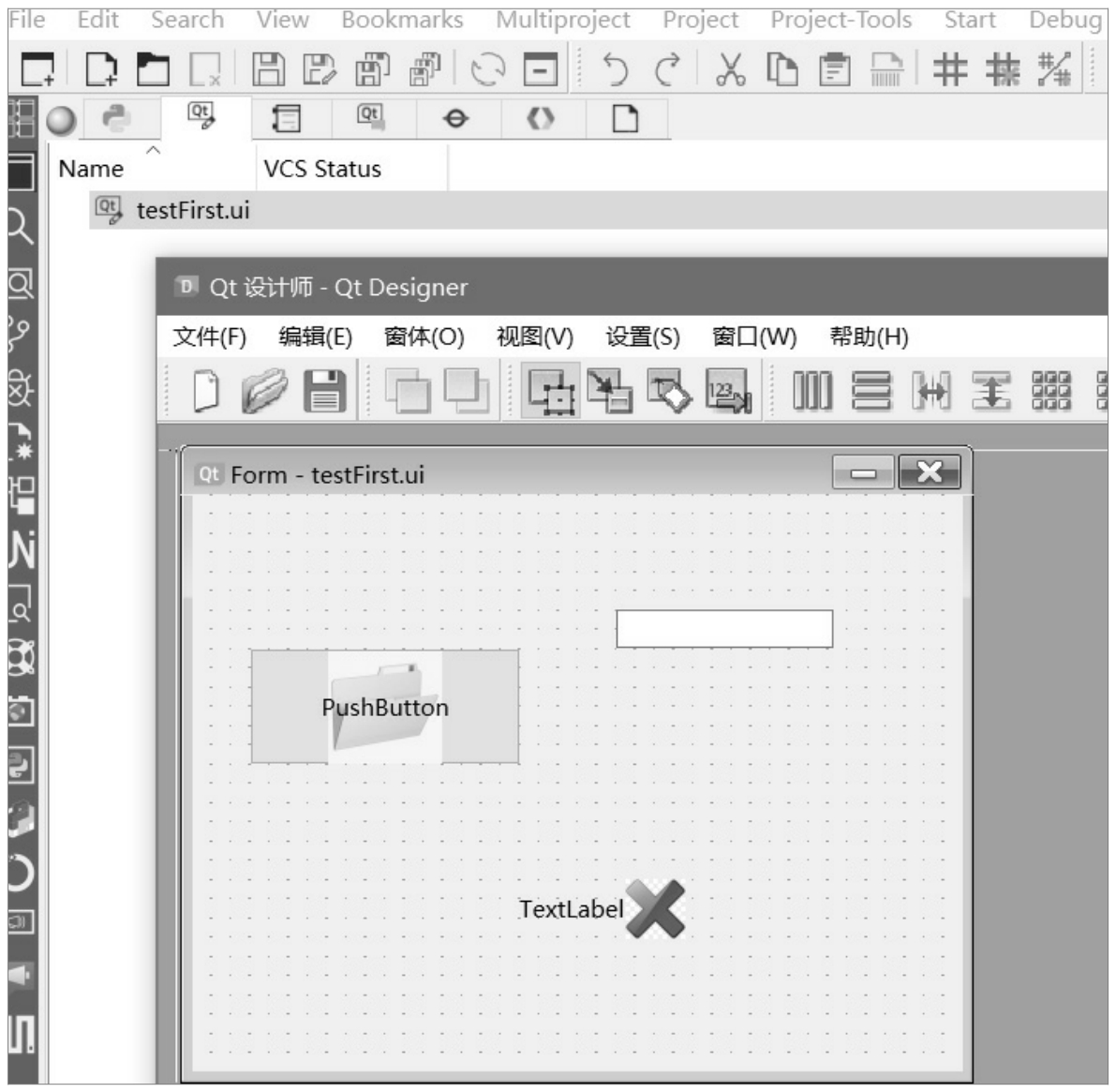 (2)切换到第2个选项,双击testFirst.ui文件,通过可视化的方式创建GUI文件,如图1-31所示。