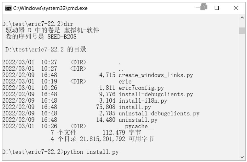 准备好安装环境之后,就可以开始安装Eric 7。在下载完安装包之后先对其进行解压缩,然后进入解压缩目录,双击install.py文件开始安装Eric 7,或者在命令行输入python install.py,使用方式如图1-27所示。