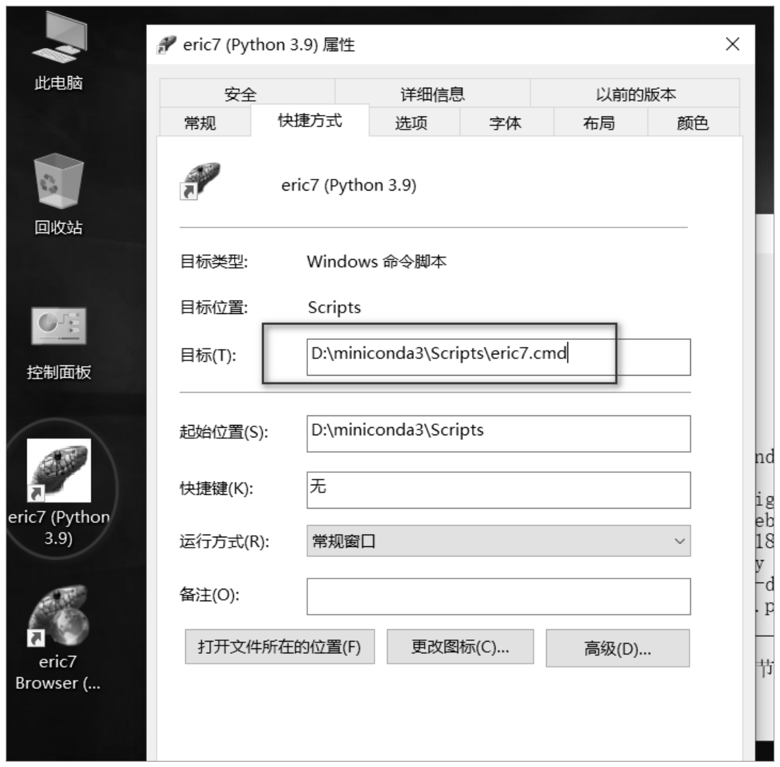 安装完成之后,会在桌面生成快捷方式eric7(Python3.9),其目标路径为D:\miniconda3\Scripts\eric7.cmd,如图1-28所示。
