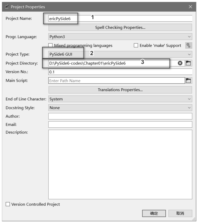 下面介绍如何建立工程文件夹。选择Project→New命令,弹出如图1-35所示的对话框,图中1、2、3处的内容需要修改。1是工程名称,对应的文件是ericPySide6.epj;2是工程类型,下拉列表中包含PySide6 GUI和PyQt6 GUI这两个选项,笔者创建的是PySide6工程,所以选择PySide6 GUI选项,这很重要,这样这个工程会自动选择pyside6-uic.exe来编译.ui文件;3是工程文件夹路径。