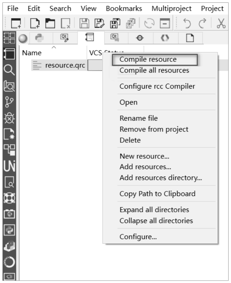 (3)切换到第3个选项,进入资源管理界面,可以看到.qrc文件,即资源管理文件,里面存储的是图片与引用路径信息。右击resource.qrc文件,在弹出的快捷菜单中选择Compile resource命令,如图1-33所示,这样就可以把resource.qrc文件编译成resource_rc.py文件。