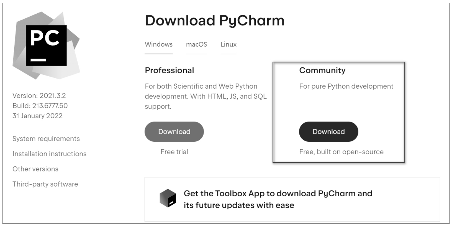 可以从官方网站下载PyCharm,在下载页面中选择Community版本,如图1-37所示。