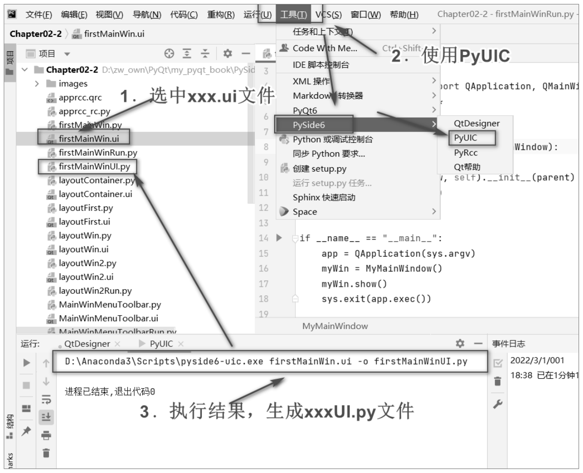 (2)图1-42中的位置5表示参数,此处填写的是$FileName$-o$FileNameWithoutExtension$UI.py,在执行过程中,以firstMainWin.ui文件为例,$FileName$转译为firstMainWin.ui,$FileNameWithoutExtension$UI.py转译为firstMainWinUI.py,最终执行的命令是D:\Anaconda3\Scripts\pyside6-uic.exe firstMainWin.ui-o firstMainWinUI.py。
