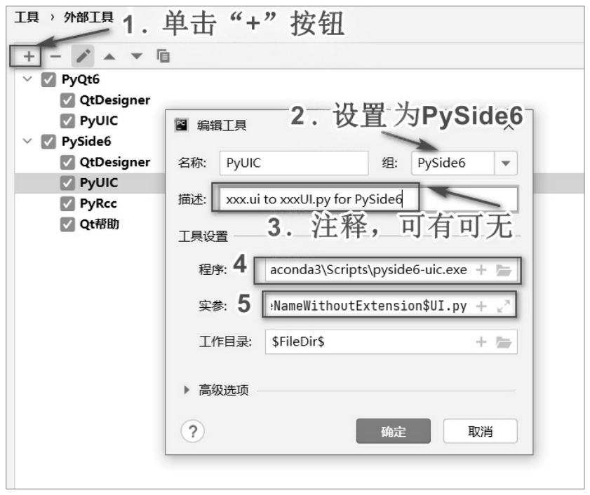 (1)图1-42中的位置4表示外部程序,此处的路径为D:\Anaconda3\Scripts\pyside6-uic.exe,读者应参考自己计算机的实际路径。