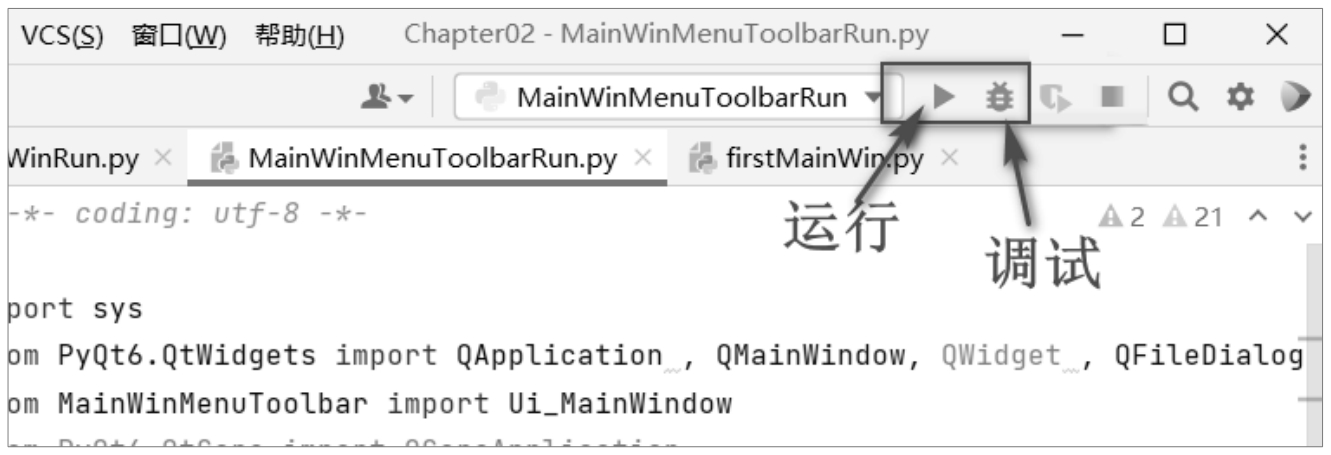 选择“运行”→“运行”命令即可启动文件,在第一次启动之后就可以使用窗口右上角的快捷方式,主要包括“运行”和“调试”两种快捷方式,如图1-46所示。
