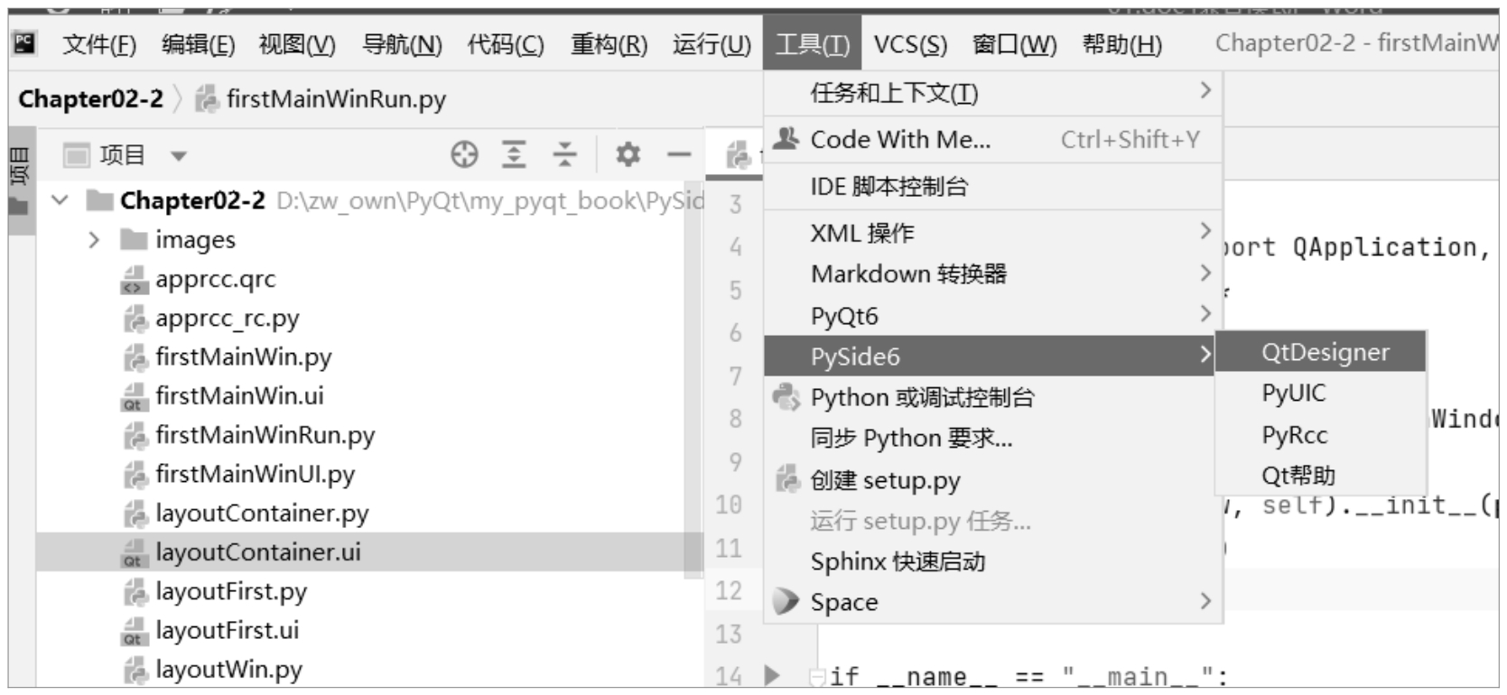 可以通过PyCharm快速打开Qt Designer、PyUIC、PyRcc、Qt帮助文档等工具,这种方式的配置方法在1.4.5节已经介绍了,这里不再赘述。具体的使用方法如图1-48所示,该操作会使用Qt Designer命令打开layoutContainer.ui文件。