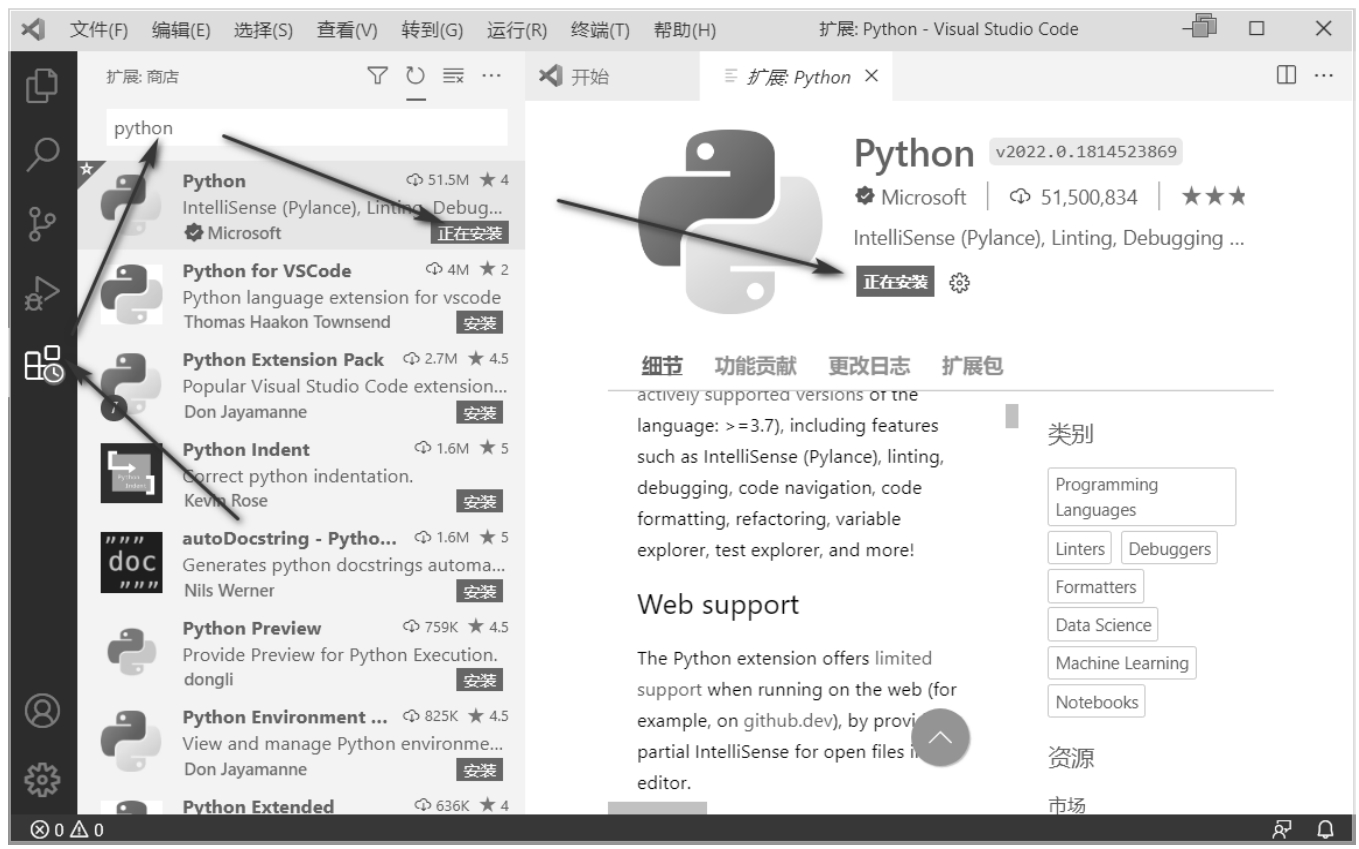 一般要安装两个插件:一个是官方推出的Python扩展,在安装这个插件之后,Python的编辑、自动补全、代码提示、跳转、运行、调试等功能都能完整支持,可以像IDE一样开发Python程序,如图1-52所示。