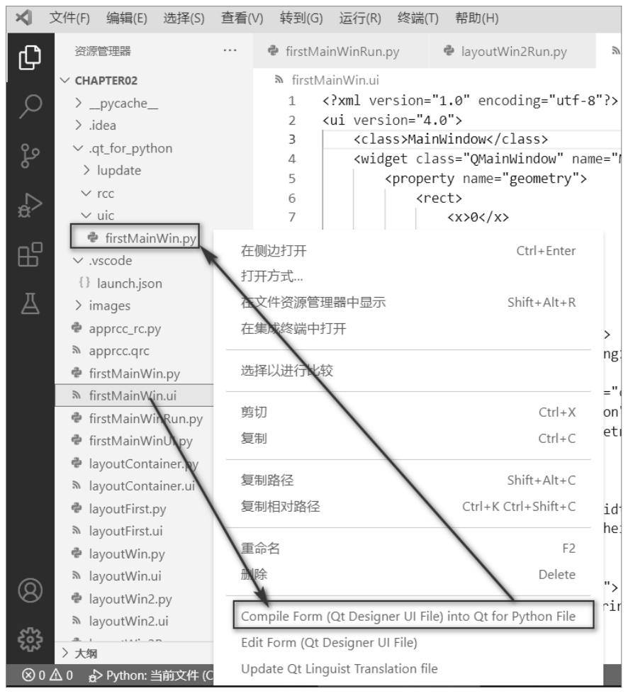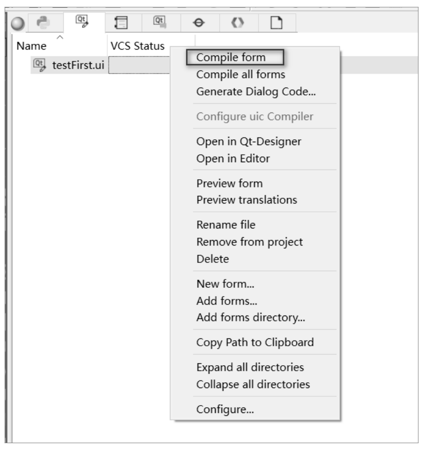 先保存编辑完的.ui文件,右击testFirst.ui文件,在弹出的快捷菜单中选择Compile form命令,如图1-32所示,编译文件,把testFirst.ui文件转换为Ui_testFirst.py文件。