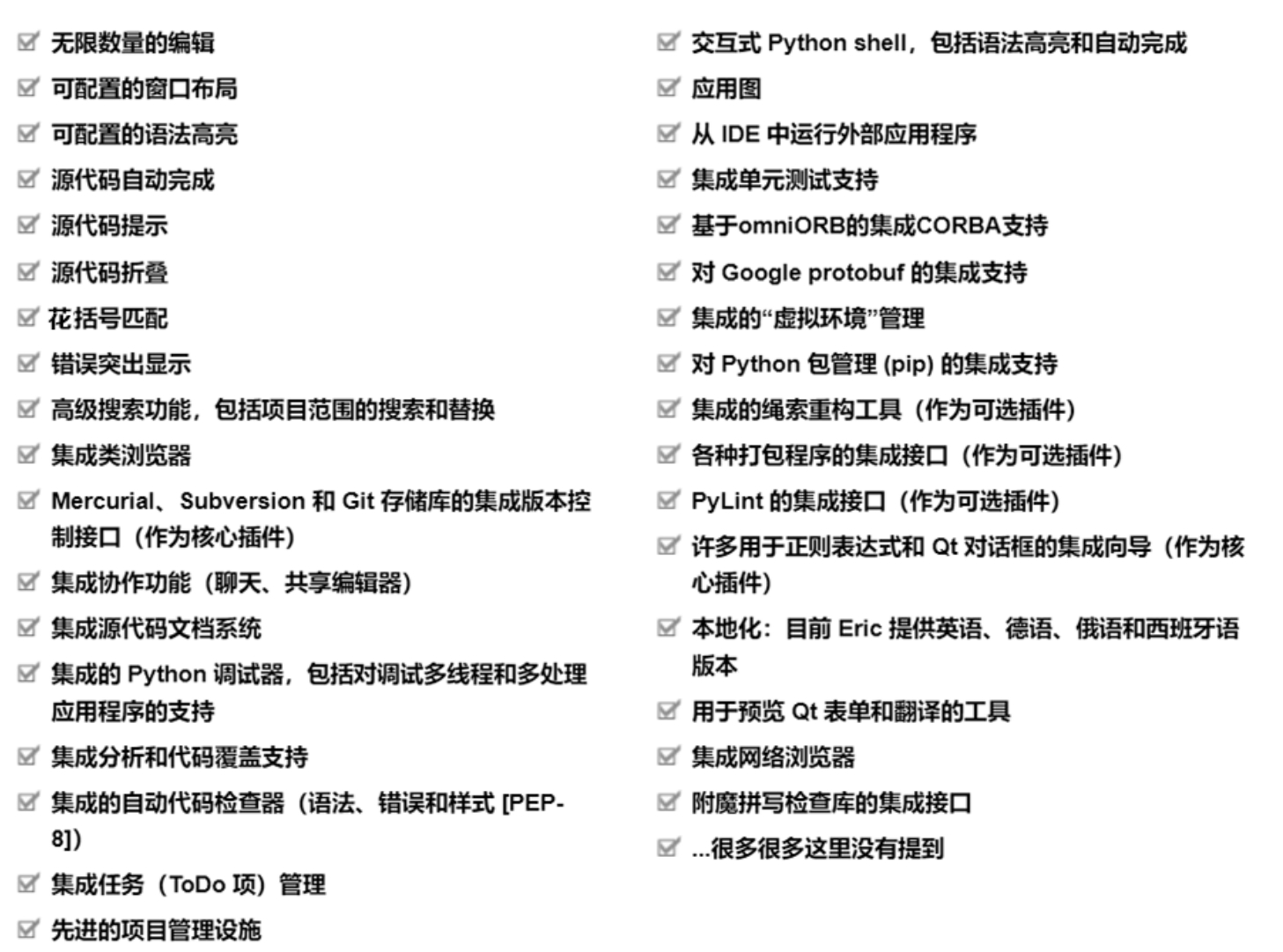 Eric是一个功能齐全的Python编辑器和IDE,使用Python编写。它基于跨平台Qt UI工具包集成了高度灵活的Scintilla编辑器控件。Eric既可以作为编辑器,也可以作为专业的项目管理工具,为Python开发人员提供许多高级功能。Eric包括一个插件系统,不仅允许用户自行下载插件,还可以轻松扩展IDE功能。最新的稳定版本是基于PyQt 6和Python 3的Eric 7,Eric有如图1-25所示的一些特征。