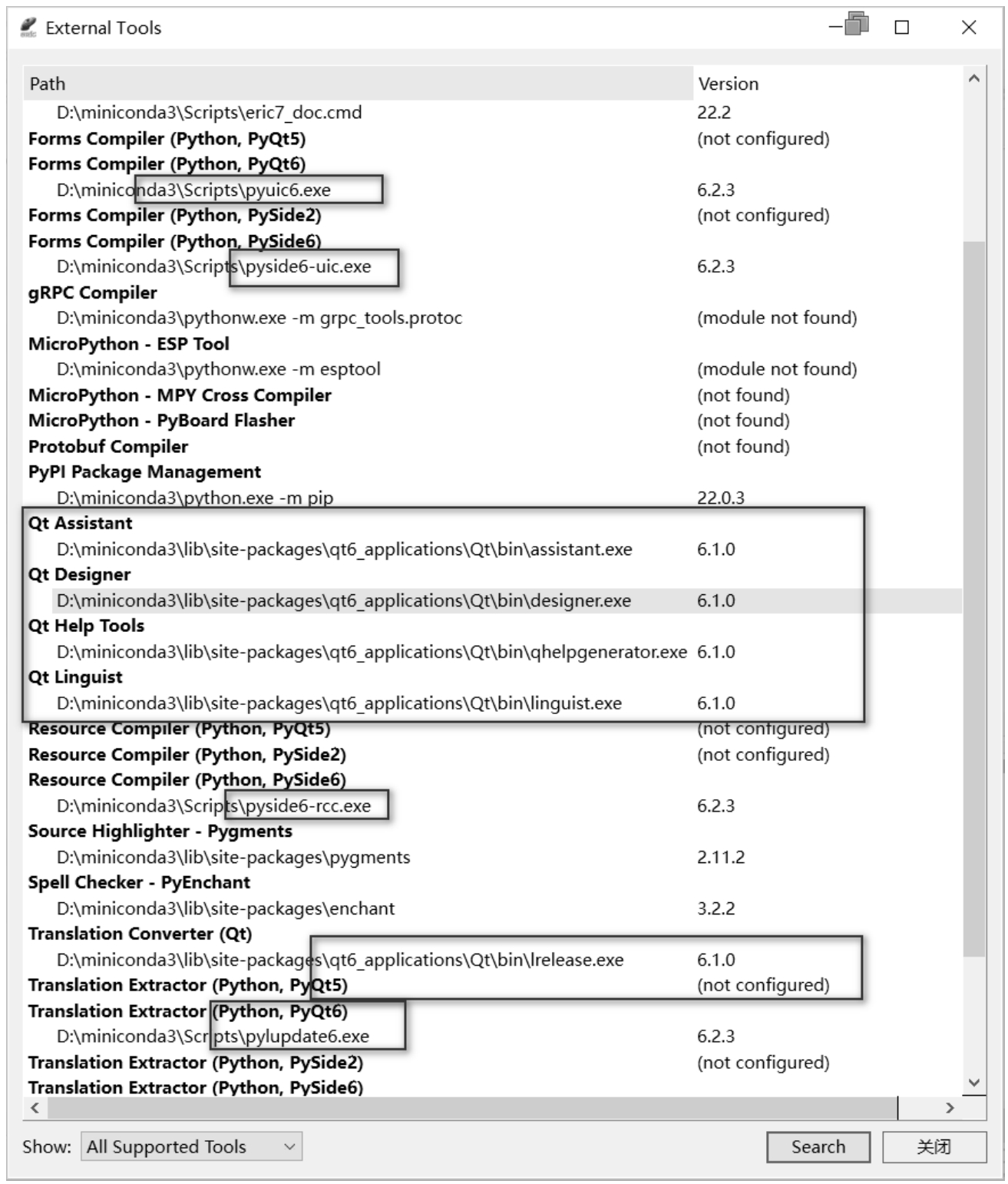 打开Eric 7,选择setting→show external tool命令,可以看到,PySide 6/PyQt 6的环境已经被识别到,如图1-29所示,Qt的各种工具都能够被检测到。