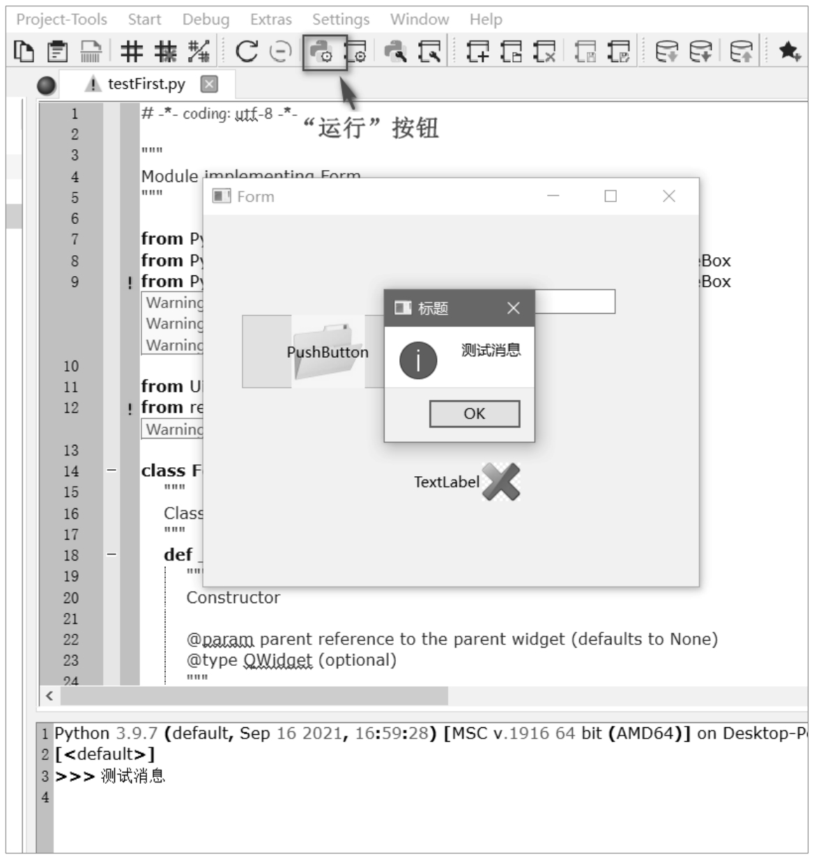 (4)切换到第1个选项,选中testFirst.py文件,先单击“运行”按钮(或按快捷键F2),再单击PushButton按钮,就会弹出如图1-34所示的提示框。