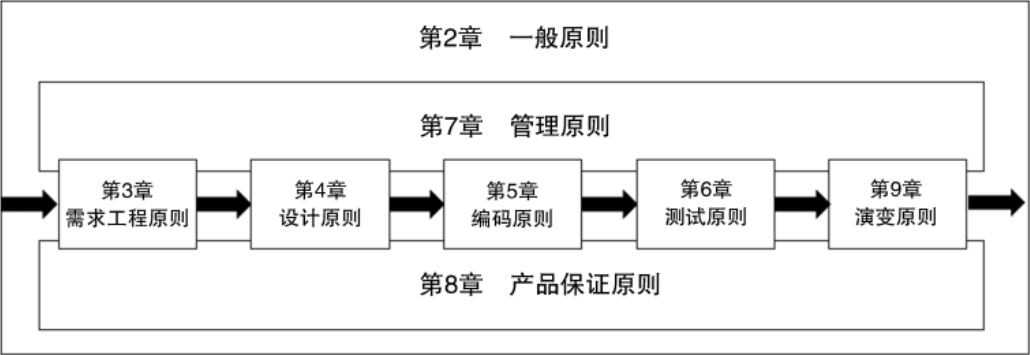 所有的原则都被划分为几个大的类别,以便查找,也便于发现类似的原则。这些类别对应于软件开发的各个主要阶段(即需求分析、设计等),也对应于其他关键的“支持”活动,如管理、产品保证等,本书的组织结构如图P-1所示。