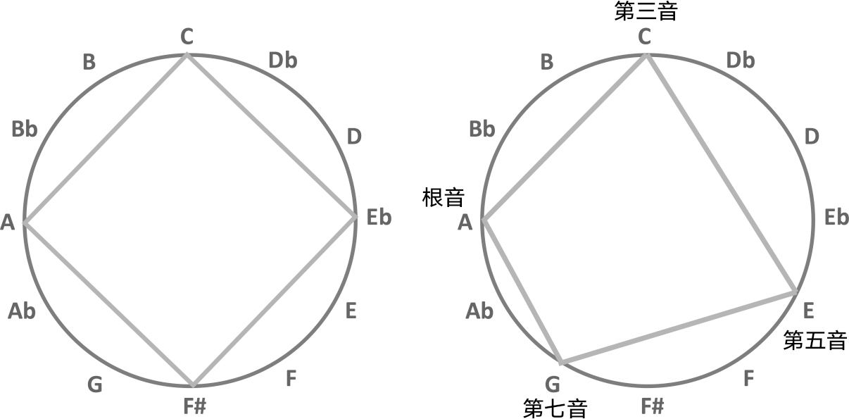 我们可以创造诸如减音阶(一个正方形)等其他对称音阶。派特·马蒂诺(Pat Martino)是当今最伟大的爵士乐吉他手之一,他于1980年患上了致命的脑动脉瘤。手术拯救了他的生命,却让他患上了失忆症,他不得不重新开始学习吉他。巧合的是,他开发了一套基于两种“亲本类型”对称性的新系统,它们与吉他指板的几何结构天生相合。这些亲本类型或者说和弦仅仅是对称的增三和弦与减七和弦。马蒂诺做过许多演示,展示了母和弦生成一系列次级和弦的力量。