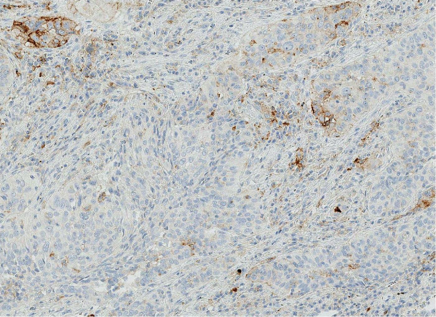 图2-14 NSCLC PD-L1 (SP263)免疫组织化学染色图(×200),1%≤TC评分<5% [7]