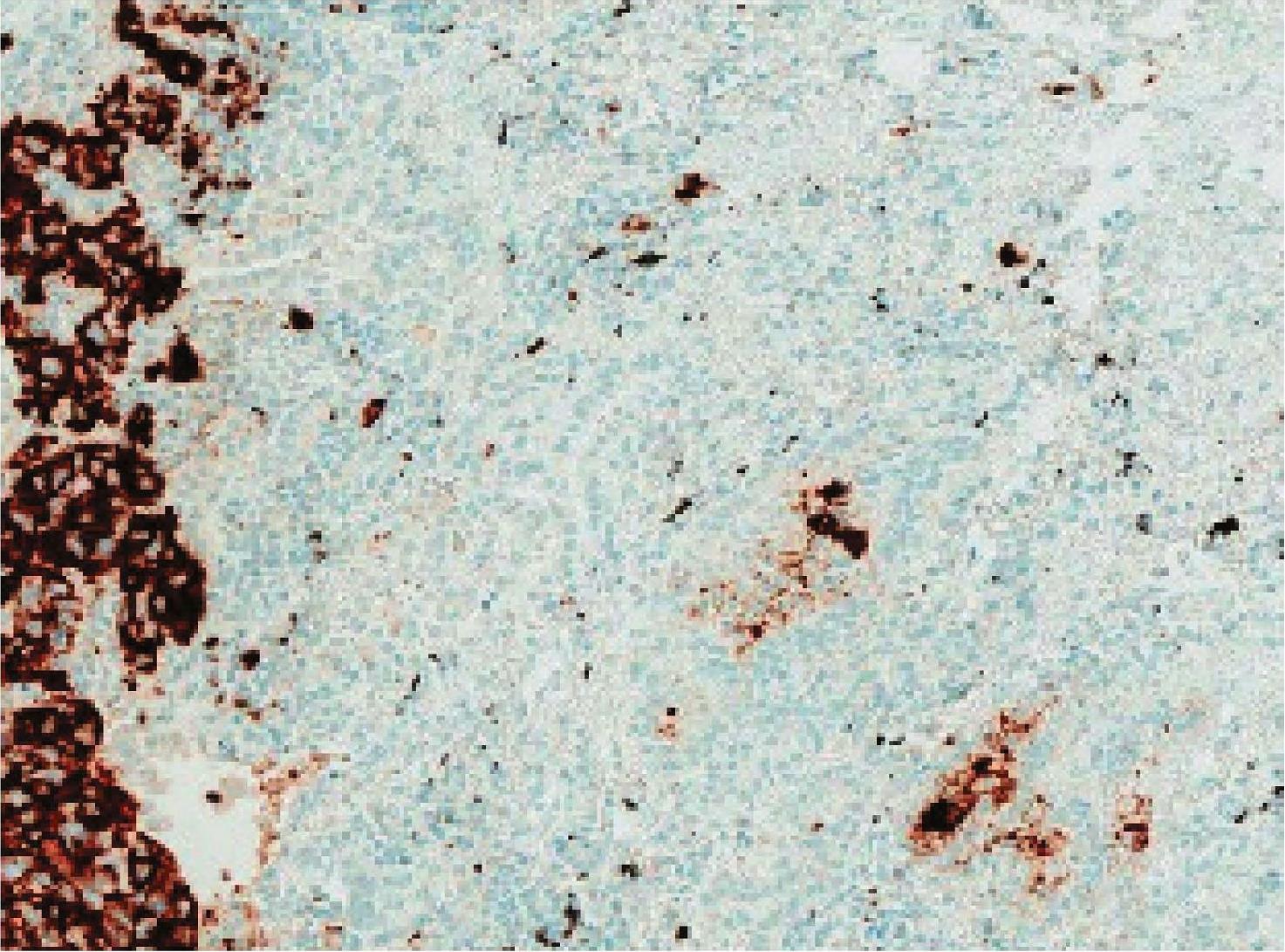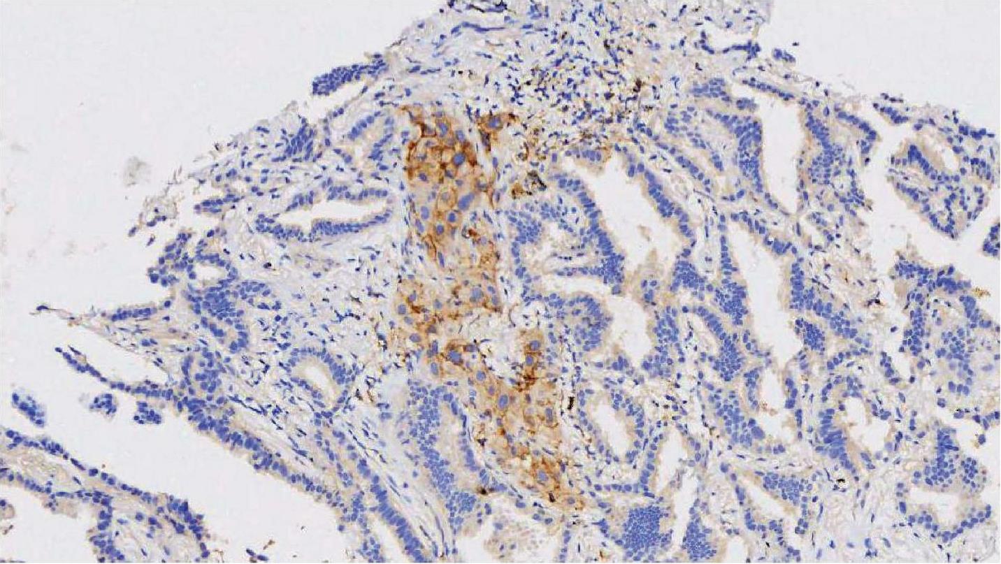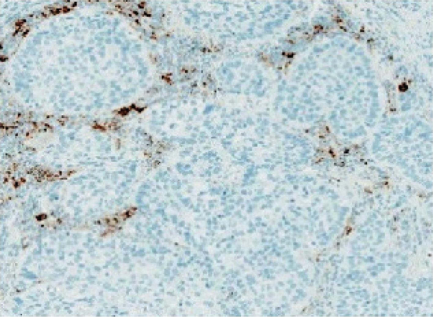 图2-4 NSCLC PD-L1 (22C3)免疫组织化学染色图(×100),TPS为1%~49% [5]