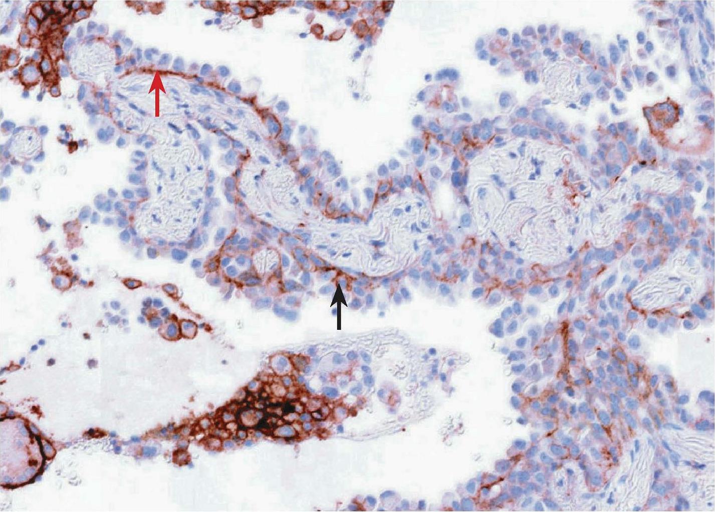 注:部分肿瘤基底膜及侧面均染色的肿瘤细胞(如黑色箭头所示),应纳入PD-L1百分比评估中;部分肿瘤细胞仅基底膜染色,侧面未染色(如红色箭头所示),不应纳入阳性肿瘤细胞;染色的免疫细胞应排除PD-L1评估
