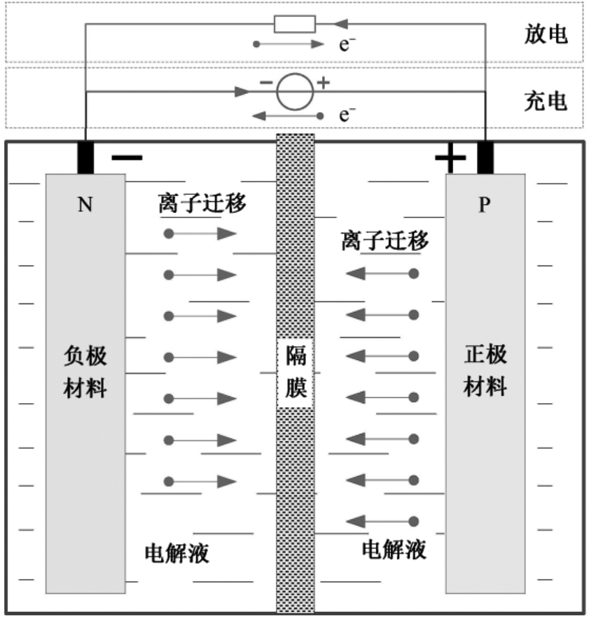 当锂离子电池工作时,由Li + 在正、负极间的往返嵌入和脱嵌形成充放电过程。充电时,Li + 正极脱嵌,经过电解液和隔膜嵌入负极,正极处于贫锂态,负极处于富锂态,同时电子的补偿电荷从外电路流入负极,保持负极的电平衡 [2] ;放电时,则正好相反。锂离子电池的工作原理如图2-4所示。