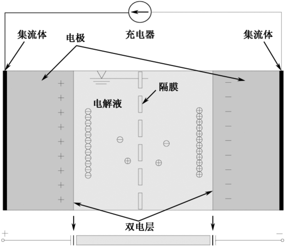 需要强调的是,双电层指在电极与电解液之间,电子和空穴彼此吸引进行排列的状态。双电层如图2-7所示。