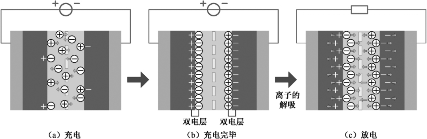 电极和电解液之间会自然产生一个绝缘层。当在两个电极之间施加电压进行充电时,正、负电荷便排列在绝缘层的两边,从而形成一个电容器。因为该绝缘层的内部分为两层,所以称为双电层。撤去外部电压后,电极上的正、负电荷与溶液中的相反电荷离子相吸,从而使双电层稳定,在正、负极间产生相对稳定的电位差。当两极与外电路连通时,电极上的电荷迁移,从而在外电路中产生电流。双电层电容器充放电过程如图2-6所示。