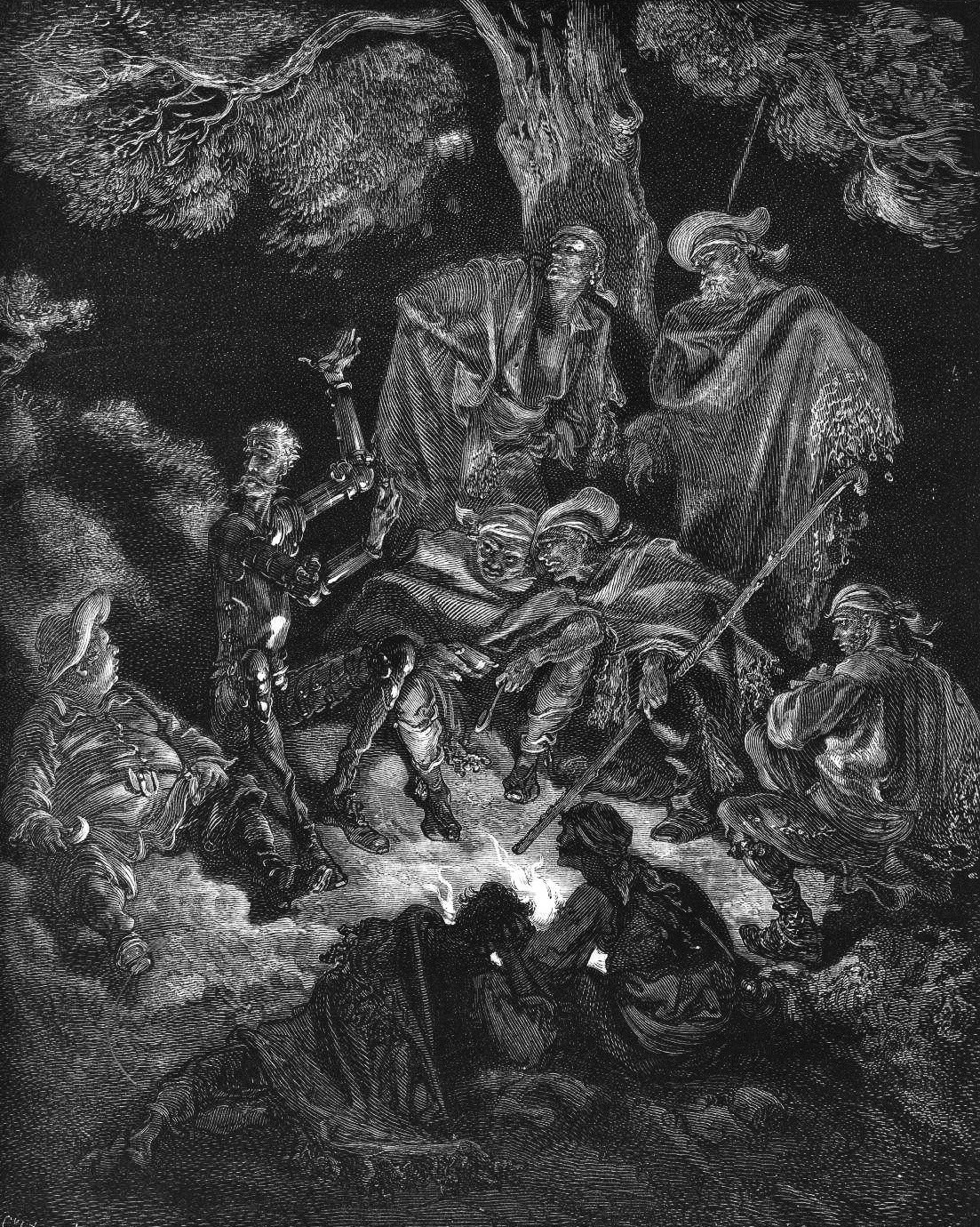 牧羊人们热情地接纳了他们。桑丘尽其所能将罗西南多和自己的毛驴安顿好,便循着香味找到了架在火上的小锅,锅里的羊肉块正咕噜咕噜地沸腾。他真恨不得立刻上去看看是否火候已到,能直接把羊肉从锅里搬到胃里去。不过倒不用他牵肠挂肚了,因为牧羊人已经把小锅从火上取下来,在地上铺开几张羊皮,食物就摊放在上面。众人很快摆放好简陋的“餐桌”,倾其所有地盛情款待堂吉诃德主仆二人。住在茅舍的六位牧人以粗简的乡村礼仪邀请堂吉诃德坐在一只倒扣的木盆上,然后大家围着羊皮坐成一圈。堂吉诃德坐下后,桑丘站在地下为他奉酒,酒杯是羊角做的。