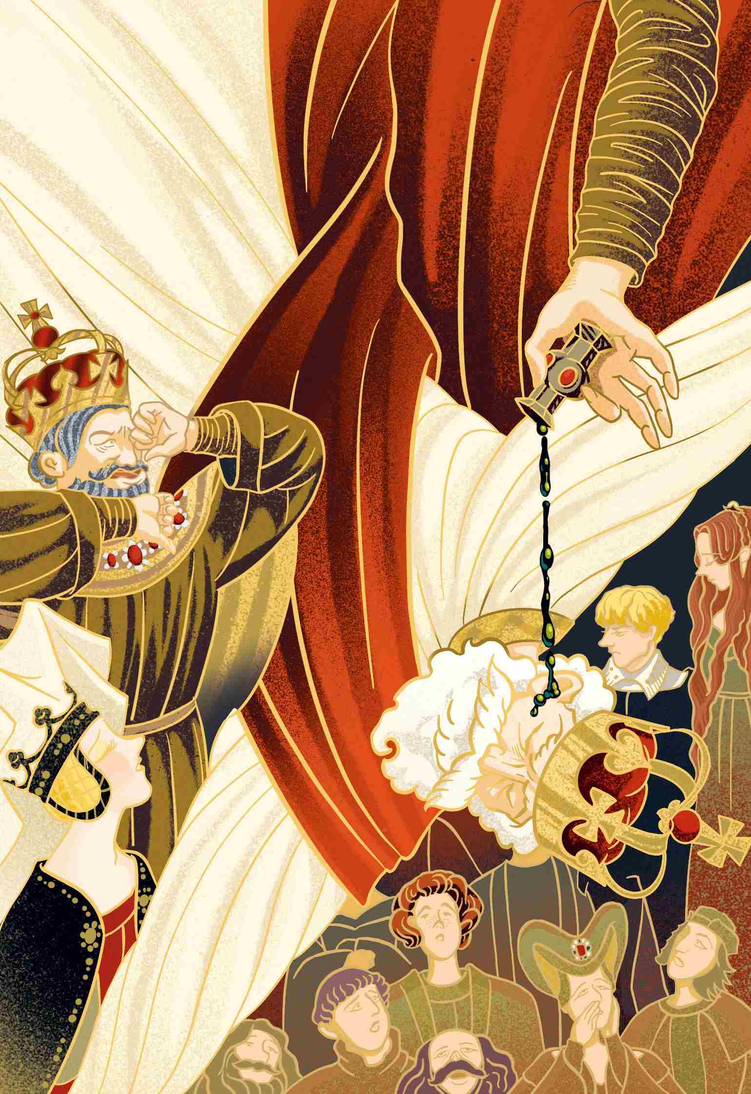 他和幽灵单独在一起后,幽灵开口说话了,说自己正是老国王的魂灵,说他是被人残忍地谋杀致死,而这个人,就是他的兄弟——王子的叔叔克劳迪。就像哈姆雷特曾经猜测的那样,叔叔为了夺取王位而下此毒手。那一天,老国王正在花园里打盹,奸佞的弟弟就乘机将一滴毒汁滴进了他的耳朵,这水银一样的毒液立刻流遍了国王全身的血管,腐蚀了他的皮肤。他的生命、皇冠及皇后就这样在一瞬间的睡梦中被自己的兄弟夺去了。幽灵恳求哈姆雷特说,如果他是真的爱过自己的父亲,就一定要为他的惨死而复仇。他又悲伤地告诫儿子,无论他用怎样的方式来报复卑鄙的叔叔,都不要做出伤害自己母亲的事情。虽然她已经在克劳迪的诱惑下一步步堕落,可还是应该留给上天和她未泯的良知去审判。哈姆雷特向父亲的魂灵保证自己会尽力照他的嘱托去做,幽灵就消逝不见了。